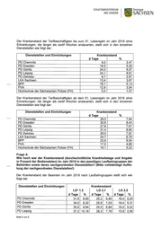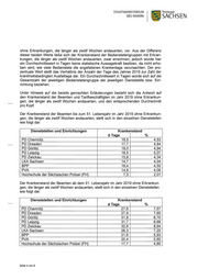 STAATSMINISTERIUM Freistaat DES INNERN SACH SEN Der Krankenstand der Tarifbeschäftigten bis zum 51. Lebensjahr im Jahr 2019 stellt sich in den einzelnen Dienststellen wie folgt dar: Dienststellen und Einrichtungen Krankenstand (2) Tage % PD Chemnitz 11,1 3,04 PD Dresden 23,7 6,49 PD Görlitz 28,1 7,71 PD Leipzig 25,7 7,05 PD Zwickau 11,9 3,26 LKA Sachsen 14,1 3,87 BPP 22,1 6,06 PVA 14,4 3,94 Hochschule der Sächsischen Polizei (FH) 5,0 1,37 Frage 2: Wie hoch war der Krankenstand (durchschnittliche Krankheitstage und Angabe in Prozent der Bediensteten) im Jahr 2019, aufgeteilt nach Tarifbeschäftigten und Beamten ab dem 51. Lebensjahr in den jeweiligen Behörden sowie deren nach- geordneten Dienststellen? (Bitte vollständige Auflistung der nachgeordneten Dienststellen!) Der Krankenstand der Beamten ab dem 51. Lebensjahr im Jahr 2019 stellt sich in den einzelnen Dienststellen wie folgt dar: Dienststellen und Einrichtungen Krankenstand @ Tage % PD Chemnitz 40,8 11,18 PD Dresden 46,6 12,77 PD Görlitz 48,8 13,37 PD Leipzig 53,4 14,62 PD Zwickau 48,4 13,27 LKA Sachsen 44,4 12,17 BPP 33,8 9,26 PVA 27,2 7,46 Hochschule der Sächsischen Polizei (FH) 17,7 4,85 Der Krankenstand der Tarifbeschäftigten ab dem 51. Lebensjahr im Jahr 2019 stellt sich in den einzelnen Dienststellen wie folgt dar: Dienststellen und Einrichtungen Krankenstand (2) Tage % PD Chemnitz 39,6 10,86 PD Dresden 45,1 12,36 PD Görlitz 45,8 12,55 PD Leipzig 44,2 12,10 PD Zwickau 34,2 9,38 LKA Sachsen 37,2 10,18 Seite 2 von 6