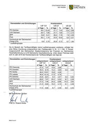 STAATSMINISTERIUM Freistaat DES INNERN SACH SEN Der Krankenstand der Tarifbeschäftigten bis zum 51. Lebensjahr im Jahr 2019 ohne Erkrankungen, die länger als zwölf Wochen andauerten, stellt sich in den einzelnen Dienststellen wie folgt dar: Dienststellen und Einrichtungen Krankenstand 0) Tage % PD Chemnitz 9,0 2,47 PD Dresden 19,5 5,35 PD Görlitz 24,0 6,57 PD Leipzig 24,1 6,61 PD Zwickau 9,7 2,67 LKA Sachsen 13,4 3,67 BPP 18,7 5,13 PVA 12,9 3,54 Hochschule der Sächsischen Polizei (FH) 5,0 1,37 Der Krankenstand der Tarifbeschäftigten ab dem 51. Lebensjahr im Jahr 2019 ohne Erkrankungen, die länger als zwölf Wochen andauerten, stellt sich in den einzelnen Dienststellen wie folgt dar: Dienststellen und Einrichtungen Krankenstand (0 Tage % PD Chemnitz 29,0 7,94 PD Dresden 30,8 8,43 PD Görlitz 27,8 7,61 PD Leipzig 31,4 8,60 PD Zwickau 28,5 7,81 LKA Sachsen 24,7 6,76 BPP 23,9 6,54 PVA 17,0 4,66 Hochschule der Sächsischen Polizei (FH) 19,1 5,22 Frage 4: Wie hoch war der Krankenstand (durchschnittliche Krankheitstage und Angabe in Prozent der Bediensteten) im Jahr 2019 in den jeweiligen Laufbahngruppen der Behörden sowie deren nachgeordneten Dienststellen? (Bitte vollständige Auflis- tung der nachgeordneten Dienststellen!) Der Krankenstand der Beamten im Jahr 2019 nach Laufbahngruppen stellt sich wie folgt dar: Dienststellen und Einrichtungen Krankenstand LG* 1.2 LG 2.1 LG 2.2 Q) Tage % Q) Tage % (6 Tage % PD Chemnitz 31,6 8,65 25,2 6,90 18,4 5,05 PD Dresden 34,0 9,32 25,6 7,03 19,4 5,31 PD Görlitz 35,9 9,84 25,0 6,84 19,0 5,22 PD Leipzig 37,2 10,18 28,3 7,76 10,8 2,95 Seite 5 von 6