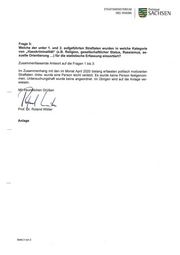 STAATSMINISTERlUM Freistaat DES INNERN SACHSEN Frage 3: Welche der unter 1. und 2. aufgeführten Straftaten wurden in welche Kategorie von „Hasskriminalität“ (z.B. Religion, gesellschaftlicher Status, Rassismus, se- xuelle Orientierung ...) für die statistische Erfassung einsortiert? Zusammenfassende Antwort auf die Fragen 1 bis 3: Im Zusammenhang mit den im Monat April 2020 bislang erfassten politisch motivierten Straftaten —|inks- wurde eine Person leicht verletzt. Es _wurde keine Person festgenom- men; Untersuchungshaft wurde keine angeordnet. Im Ubrigen wird auf die Anlage ver- wiesen. M' reun lichen Grüßen ff.»; Prof. r. Roland Wöller Anlage Seite 2 von 2