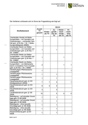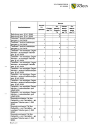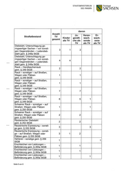 STAATSMINISTERIUM Freistaat DES INNERN SACHSEN Die Verfahren schlüsseln sich im Sinne der Fragestellung wie folgt auf: davon Anzahl Ju- Heran- Er- Straftatbestand TV Kinder gendli- wach- wach- gesamt als TV che als sende sene TV als TV als TV Unerlaubter Handel mit Betäu- bungsmitteln — mit Cannabis und Zubereitungen — unerlaubter Han- del gem. § 29 Abs. 1 Nr. 1 Betäu- bungsmittelgesetz (BtMG) Unerlaubter Besitz von Betäu- bungsmitteln — von Cannabis und Zubereitungen gem. § 29 Abs. 1 Nr. 3 BtMG Unerlaubter Besitz von Betäu- bungsmitteln — von Cannabis und Zubereitungen gem. § 29 Abs. 1 Nr. 3 BtMG Unerlaubter Besitz von Betäu- bungsmitteln — von Methamphe- tamin in kristalliner Form (Crystal) gem. § 29 Abs. 1 Nr. 3 BtMG Verstoß gegen Pflichtversiche- rungsgesetz Verstoß gegen Pflichtversiche- rungsgesetz Verstoß gegen Pflichtversiche- rungsgesetz Hausfriedensbruch gem. § 123 Strafgesetzbuch (StGB) Hausfriedensbruch gem. § 123 StGB Hausfriedensbruch gem. § 123 StGB Landfriedensbruch gem. § 125 StGB Beleidigung - auf sexueller Grund- lage gem. § 185 StGB Beleidigung — auf sexueller Grund- lage gem. § 185 StGB Beleidigung — ohne sexuelle Grundlage gem. § 185 StGB Beleidigung — ohne sexuelle Grundlage gem. § 185 StGB Körperverletzung gem. § 223 StGB Seite 2 von 8
