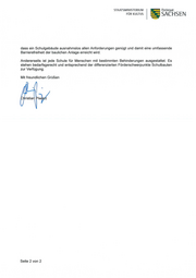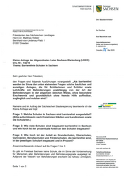 ~ SACHsEN STAATSMlNlSTERlUM FÜR KULTUS Der Staatsminister SÄCH SISCHES STAATSMINISTERIUM FÜR KULTUS Ihr Zeichen Postfach 10 09 10 101079 Dresden Präsidenten des Sächsischen Landtages Ihre Nachricht vom Herrn Dr. Matthias Rößler Bernhard-von-Lindenau-Platz 1 Geschäftszeichen 01067 Dresden (bitte bei Antwort angeben) Z-1053/21/31 Dresden, ~Mai 2020 Kleine Anfrage der Abgeordneten Luise Neuhaus-Wartenberg (LINKE) Drs.-Nr.: 7/2215 Thema: Barrierefreie Schulen in Sachsen Sehr geehrter Herr Präsident, den Fragen sind folgende Ausführungen vorangestellt: „Als barrierefrei werden im Sinne der unten stehenden Fragen solche baulichen und sonstigen Anlagen, die für Schülerinnen und Schüler sowie Lehrkräfte mit Behinderungen unabhängig von der Art der Behinderungen in der allgemein üblichen Weise, ohne besondere Erschwernis und grundsätzlich ohne fremde Hilfe auffindbar, zugänglich und nutzbar sind." MACH _ __ WAS Namens und im Auftrag der Sächsischen Staatsregierung beantworte ich die - WICHTIGES A1bd1 t n im Öfftntl id1t n Dirn \1 S11<'hu n Kleine Anfrage wie folgt: Frage 1: Welche Schulen in Sachsen sind barrierefrei ausgestattet? (Bitte aufschlüsseln nach Kreisfreien Städten und Landkreisen sowie die Schularten.) Frage 2: Wie viele Schulen sind insgesamt barrierefrei in Sachsen und wie hoch ist der prozentuale Anteil an den Schulen insgesamt? Frage 3: Wie hoch ist der Anteil an Grundschulen, Oberschulen, Hausanschrift: Gymnasien, Berufsschulen und Förderschulen, die barrierefrei sind, Sächsisches Staatsministerium in der jeweiligen Schulart insgesamt und in Prozent? für Kultus Carolaplatz 1 01097 Dresden zusammenfassende Antwort auf die Fragen 1 bis 3: www.smk. sachsen .de Es gibt im Freistaat Sachsen keine Schule, die im Sinne der Vorbemerkung Verkehrsverbindung : für Menschen aller Behinderungen und Behinderungsgrade ausgelegt ist. Zu erreichen mit den Straßenbahnlinien 3, 7, 8 Aufgrund der Vielzahl von Behinderungen erscheint es nahezu unmöglich , Informationen zum Zugang für elektronisch signierte sowie für verschlüsselte elektronische Dokumente erhalten Sie unter Seite 1 von 2 www.smk.sachsen.de/kontakt.htm