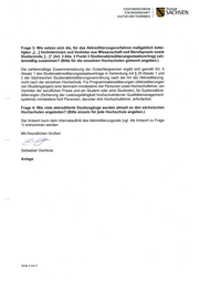 STAATSMINISTERIUM Freistaat FÜR WISSENSCHAFT SACHSEN KULTUR UND TOURISMUS Frage 3: Wie setzen sich die, für das Akkreditierungsverfahren maßgeblich betei ligten „[...] Vertreterinnen und Vertreter aus Wissenschaft und Berufspraxis sowie Studierende,[...]"(Art. 3 Abs. 2 Punkt 3 Studienakkreditierungsstaatsvertrag)zah lenmäßig zusammen? (Bitte für die einzelnen Hochschulen getrennt angeben.) Die zahlenmäßige Zusammensetzung der Gutachtergremien ergibt sich gemäß Art. 4 Absatz 1 des Studienakkreditierungsstaatsvertrags in Verbindung mit § 25 Absatz 1 und 2 der Sächsischen Studienakkreditierungsverordnung nach der Art der Akkreditierung, nicht nach der einzelnen Hochschule. Für Programmakkreditierungen (Akkreditierungen von Studiengängen)sind demnach mindestens vier Personen (zwei Hochschullehrer, ein Vertreter der beruflichen Praxis und ein Student oder eine Studentin), für Systemakkre ditierungen (Sicherung der Leistungsfähigkeit hochschulinterner Qualitätsmanagement systeme) mindestens fünf Personen, darunter drei Hochschullehrer, erforderlich. Frage 4: Wie viele akkreditierte Studiengänge werden aktuell an den sächsischen Hochschulen angeboten? (Bitte einzeln für jede Hochschule angeben.) Die Antwort kann dem Internetauftritt des Akkreditierungsrats (vgl. die Antwort zu Frage 1) entnommen werden. Mit freundlichen Grüßen Sebastian Gemkow Anlage Seite 2 von 2