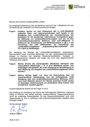 STAATSIVIINISTERIUM Freistaat FÜR ENERGIE, KLIIVIASCHUTZ, SACHSEN UI\4WER UND TANDWIRTSCHAFT Der Staatsminister SACHSIScHES STAATSMINISTERIUIV FÜR ENERGIE, KLII\4ASCHUTz. UMWELT UND LANDWIRTscHAFT 01076 Dresden Präsidenten des Sächsischen Landtages Herrn Dr. Matthias Rößler Durchwahl Telefon +49 351 564-20000 Bernhard-von-Lindenau-Platz 1 Telefax +49 351 564-20007 01067 Dresden poststelle@ smul.sachsen.de lhr Zeichen lhre Nachricht vom Kleine Anfrage des Abgeordneten Jan Hippold (CDU) 28. Februar 2020 Drs.-Nr.:711831 Aktenzeichen Thema: Wasserkraftanlage Erdmannsdorf (bitte bei Antwort angeben) z-1050151191 Sehr geehrter Herr Präsident, Dresden, 27. März2O2O den Fragen sind folgende Ausführungen vorangestellt: ,,Die Genehmigung der Wasserkraftanlage Erdmannsdorf dauert nunmehr schon mehr als 5 Jahre an. Gründe für dieses langwierige Verfahren sind unbekannt." Namens und im Auftrag der Sächsischen Staatsregierung beantworte ich MACH- die Kleine Anfrage wie folgt: I WAS WICHTIGES Arbeiten im öff€ntlirhen Dienst Sachsen Frage 1: Wie ist allgemeine der Verfahrensstand bezüglich des Vorhabens der WKA Erdmannsdorf? lst eine Befreiung nach S 67 | BNatschG für das Vorhaben WKA Erdmannsdorf inzwischen erteilt worden und ggf. wann? Hausanschrift: Welche Gründe sprechen für diese Befreiung? Sächsisches Staatsministerium für Energie, Klimaschutz, Umwelt und Landwirtschaft Frage 2: lst die wasserrechtliche Entscheidung betreffend die Wilhelm-Buck-Str. 2 Wiederaktivierung der WKA Erdmannsdorf inzwischen 01097 Dresden getroffen worden und ggf. wann? www.smul.sachsen.de Zusammenfassende Antwort auf die Fragen 1 und 2: Verkehrsverbindung: Zu erreichen mit den Straßenbahnlinien 3, 6, 7, 8, 13 Das wasserrechtliche Zulassungsverfahren betreffend die Besucherparkplätze: Wiederaktivierung der Wasserkraftanlage (WKA) Erdmannsdorf dauert Bitte beim Empfang Wilhelm- noch an, eine wasserrechtliche Entscheidung wurde noch nicht getroffen. Buck-Str.2 melden. o $ Zum gegenwärtigen Zeitpunkt erfolgt die fachliche Prüfung Bitte beachten Sie die allgemeinen Hinweise zur o) sf N beziehungsweise Auseinandersetzung mit der erforderlichen Verarbeitung personenbezogener o (\ Mindestwasserführung (MWA) an der WKA Erdmannsdorf. Aufgrund Daten durch das Sächsische Staatsministerium für Energie, o c! dessen, dass es sich um ein laufendes Verfahren handelt, können . im Klimaschutz, Umwelt und gegenwärtigen Verfahrensstadium keine konkreten Aussagen z.) Landwirtschait zur Erfüllung der lnformationspflichten nach der verfahrens- und/oder entscheidungsrelevanten Aspekten - insbesondere Europäischen Datenschutz- auch nicht zu einer möglichen Befreiung nach g 67 Abs. 1 BNatSchG - im Grundverordnung auf www.smul.sachsen.de Seite 1 von 2