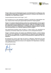 ~ SACHsEN STAATSMlNlSTERlUM FÜR KULTUS Der Staatsminister SÄCHSISC HES STAATSMINI STERIUM FÜR KULTU S Ihr Zeichen Postfach 1O 09 1O 1 01079 Dresden Ihre Nachricht vom Präsidenten des Sächsischen Landtages 18. Februar 2020 Herrn Dr. Matthias Rößler Bernhard-von -Lindenau-Platz 1 Geschäftszeichen (bitte bei Antwort angeben) 01067 Dresden Z-1053/20/33 Dresden, { l . März 2020 Kleine Anfrage des Abgeordneten Dr. Rolf Weigand (AfD) Drs.-Nr.: 7/1724 Thema: Nachfrage zur Kleinen Anfrage Drs 7/862: „Nachfrage zu Drs 7/518 - Anwendung des SächsNSG auf E-Zigaretten und Tabakerhitzer und die Reglementierung des Konsums an Schulen" Sehr geehrter Herr Präsident, den Fragen sind folgende Ausführungen vorangestellt: "In Drs 7/862 führt die Staatsregierung folgendes aus: 'Da das Sächsis che Nichtraucherschutz- gesetz den Konsum von Tabakerhitzern oder E-Zigaretten nicht umfasst, wird das Sächsische Staatsministerium für Kultus bis zu einer gesetzli- chen Regelung das Landesjugendamt und die Jugendämter der Land- kreise und Kreisfreien Städte sowie die Träger von Kindertageseinrich- tungen auffordern, geeignete Maßnahmen zu ergreifen, um die Kinder MACH _ __ vor Gefahren zu schützen, die vom Konsum von Tabakerhitzern und E- WAS - WICHTIGES Zigaretten ausgehen können. Dies kann zum Beispiel im Rahmen der Arbtitr n im Öfftntlichtn D ir n ~ ! Sach~tn Hausordnung durch die Einrichtungsträger ges chehen.' Noch in Drs 7/518, Frage 2 führte die Staatsregierung aus: 'Aus Sicht der Sächsischen Staatsregierung bedarf es derzeit keiner rechtlichen Klar- stellung, dass das Sächsische Nichtraucherschutzgesetz (SächsNSG) auf E-Zigaretten und Tabakerhitzer nicht anwendbar ist. Die gesetzliche Regelung und deren Auslegung, die für E-Zigaretten durch obergericht- liche Rechtsprechung überwiegend bestätigt wurde, ist eindeutig und in der Rechtspraxis gefestigt.'" Namens und im Auftrag der Sächsischen Staatsregierung beantworte ich die Kleine Anfrage wie folgt: Hausanschrift: Sächsisches Staatsministerium für Kultus Frage 1: Inwieweit ist die oben angeführte Aussage der Staatsregierung Carolaplatz 1 01097 Dresden aus Drs 7/862 so zu verstehen, dass die Staatsregierung eine Änderung des SächsNSG in Bezug auf die Erfassung von E-Zigaretten und Taba- www.smk. sachsen .de kerhitzern vornehmen will oder anstrebt oder welche andere „gesetzli- Verkehrsverbindung: che Regelung" ist dort gemeint? Zu erreichen mit den Straßenbahnlinien 3, 7, 8 Informationen zum Zugang für elekt- ronisch signierte sowie für verschlüs- selte elektronische Dokumente erh al- ten Sie unter www.sm k.sach- Seite 1 von 2 sen.de/kontakt.htm