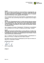 STAATSMiNiSTERiUM Freistaat DES iNNERN SACHSEN Frage 3: Wie hoch ist (Stand 31.12.2018) das Durchschnittsalter in Dippoldiswalde, wie hoch wird es nach Bevölkerungsprognose in den Jahren 2020, 2025 und 2030 sein (Bitte Aufschlüsseln nach Ortsteilen, nach Männern, Frauen und gesamt, sowie die Veränderung in Jahren gegenüber 2018 angeben)? Zum 31. Dezember 2018 betrug das Durchschnittsalter ip Dippoldiswalde 48,0 Jahre; bei Männern 46,1 Jahre und bei Frauen 49,8 Jahre. Im Ubrigen wird auf die Anlage 2 verwiesen. Frage 4: Wie viele der in Dippoldiswalde (Stand 31.12.2018) lebenden Menschen befinden sich in erwerbsfähigem Alter, wie wird sich das nach prognostizierter Bevölke- rungsentwicklung in den Jahren 2020, 2025 und 2030 verändern (bitte aufschlüs- seln nach Ortsteilen, nach Männern, Frauen, gesamt und prozentualer Verände- rung gegenüber 2018)? Zum 31. Dezember 2018 waren in Dippoldiswalde 7.735 Menschen im enNerbsfähigen Alter; 4.002 Männer und 3.733 Frauen. lm Ubrigen wird auf die Anlage 1 verwiesen. Frage 5: Wie ist das Geschlechterverhältnis Männer zu Frauen (Stand 31. 12. 2018) in Dip- poldiswalde, wie wird es sich in den Jahren 2020, 2025 und 2030 entwickeln (Bit- te aufschlüsseln nach Ortsteilen, nach Alterskohorten 18 bis 30 Jahre, 31 bis 45 Jahre, 46 bis 65 Jahre und über 65 Jahre)? Zum 31. Dezember 2018 b__etrug das Geschlechterverhältnis in Dippoldiswalde 97,7 Männer auf 100 Frauen. Im Ubrigen wird auf die Anlage 3 venNiesen. Des Weiteren wird auf die Antwort der Staatsregierung auf die Frage 5 der Kleinen An- frage Drs.-Nr. 7/249 Absatz 2 verwiesen. Mit fre ndliche Grüßen Pro . Roland Dr. Wöller Anlagen: 3 Seite 2 von 2