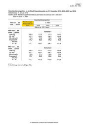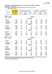 Anlage 1 zu Drs.-Nr. 7/251 Bevölkerung" der Stadt Dippoldiswalde am 31. Dezember 2018, 2020, 2025 und 2030 Gebietsstand: 1. Januar 2019 Quelle: 2018 - Bevölkerungsfortschreibung auf Basis des Zensus vom 9. Mai 2011 2020 bis 2030 - 6. RBV Voraussichtliche Bevölkerung Veränderung gegenüber 2018 Merkmal 2020 2025 2030 2020 2025 2030 1000 % Alter von bis Variante 1 unter Jahren Insgesamt unter 20 2.615 2,6 2,5 2,4 -2,4 -3,5 -10,0 20 - 652) 7.735 7,7 7,0 6,3 -0,8 -9,6 —19,0 65 und mehr 4.082 3,8 3,9 4,2 —5‚7 —3‚8 2,1 lnsgesamt 14.432 14,1 13,4 12,8 -2,5 -6,9 -11‚4 männlich unter 20 1.369 1,3 1,3 1,2 -1,8 —2,9 -9,9 20 — 652) 4.002 4,0 3,6 3,2 -1‚1 —10,8 -19,9 65 und mehr 1.760 1,7 1,7 1,8 —4,8 -1,8 5,1 Insgesamt 7.131 7,0 6,6 6,3 -2,2 -7,1 -11,8 weiblich unter 20 1.246 1,2 1,2 1,1 —3,0 -4,2 —10,1 20 - 652’ 3.733 3,7 3,4 3,1 -0,4 -8,3 -18‚0 65 und mehr 2.322 2,2 2,2 2,3 -6,4 -5,3 - 0,2 Insgesamt 7.301 7,1 6,8 6,5 -2,8 -6,7 -11‚0 Alter von bis Variante 2 unter Jahren Insgesamt unter 20 2.615 2,4 2,3 2,2 -7,3 -10,3 -17,5 20 - 652) 7.735 7,4 6,8 6,1 -4,2 -12,5 -21‚6 65 und mehr 4.082 3,8 3,9 4,2 -5,8 -4,1 1,7 Insgesamt 14.432 13,7 13,0 12,4 -5,2 -9,7 -14,3 männlich unter 20 1.369 1,3 1,2 1,1 -6,6 -9,7 -17,5 20 - 652’ 4.002 3,9 3,5 3,2 -3,5 —12,0 —20,8 65 und mehr 1.760 1,7 1,7 1,8 -4,9 -2,2 4,5 lnsgesamt 7.131 6,8 6,5 6,1 -4‚5 -9‚1 -13‚9 weiblich unter 20 1.246 1,1 1,1 1,0 -8,1 -11,0 -17,5 20 - 652) 3.733 3,6 3,2 2,9 -4,9 -13,2 -22,4 65 und mehr 2.322 2,2 2,2 2,3 -6,5 -5,5 — 0,5 Insgesamt 7.301 6,9 6,5 6,2 -6,0 -10,3 -14,6 1) Die Ergebnisse der Bevölkerungsfortschreibung 2018 können Fälle mit unbestimmtem Geschlecht enthalten, die durch ein definienes Umschlüsselungsverfahren auf männlich und weiblich verteilt wurden. 2) Bevölkerung im en/verbsfähigen Alter © Statistisches Landesamt des Freistaates Sachsen