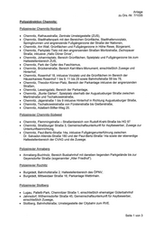 Anlage zu Drs.-Nr. 7/1035 Polizeidirektion Chemnitz: Polizeirevier Chemnitz-Nordost Chemnitz, Rathausstraße, Zentrale Umsteigestelle (ZUS), Chemnitz, Stadthallenpark mit den Bereichen Grünfläche, Stadthallenvorplatz, Springbrunnen und angrenzende Fußgängerzone der Straße der Nationen, Chemnitz, Am Wall, Grünflächen und Fußgängerzone in Höhe Rewe, Bürgeramt, Chemnitz, Parkplatz Tietz mit den a'ngrenzenden Straßen Moritzstraße, Zschopauer Straße, inklusive „Hallo Döner Drive", Chemnitz, Johannisplatz, Bereich Grünflächen, Spielplatz und Fußgängerzone bis zum Haltestellenbereich ZUS, Chemnitz, Park der Opfer des Faschismus, Chemnitz, Brückenstraße, Bereich KarI-Marx-Monument, einschließlich Zuwege und Hinterhof, Chemnitz, Rosenhof 18, inklusive Vorplatz und die Grünflächen im Bereich der Häuserkarees Rosenhof 1 bis 9, 11 bis 29 sowie Bahnhofstraße 58 bis 78, Chemnitz, Theodor-Körner-PIatz, Bereich der Parkanlage inklusive der angrenzenden Straßen, Chemnitz, Lessingplatz, Bereich der Parkanlage, Chemnitz, „Bunte Gärten“, Spielplatz oberhalb der Augustusburger Straße zwischen Martinstraße und Tschaikowskistraße, Chemnitz, Jägerstraße 1 bis 9 inklusive Hinterhof in Richtung Augustusburger Straße, Chemnitz, Tschaikowskistraße von Fürstenstraße bis Gießerstraße, Chemnitz, Adalbert-Stifter-Weg 25. Polizeirevier Chemnitz-Südwest Chemnitz, Flemmingstraße — Straßenbereich von Rudolf—KrahI-Straße bis HG 9? Chemnitz, Straßburger Straße 3, Gemeinschaftsunterkunft für Asylbewerber, Zuwege zur Unterkunftseinrichtung, Chemnitz, PauI-Bertz-Straße 143, inklusive Fußgängerunterführung zwischen Dr. Salvador-AIIende-Straße 180 und der PauI-Bertz-Straße 14a sowie der ebenerdige Haltestellenbereich der CVAG und die Zuwege. Polizeirevier Annaberg . Annaberg-Buchholz, Bereich Busbahnhof mit daneben liegenden Parkgelände bis zur Geyersdorfer Straße (sogenannter „Alter Friedhof“). Polizeirevier Rochlitz Burgstädt, Bahnhofstraße 2, Haltestellenbereich des ÖPNV, Burgstädt, Mittweidaer Straße 16, Parkanlage Wettinhain. Polizeirevier Stollberg Lugau, Palletti-Park, Chemnitzer Straße 1, einschließlich ehemaliger Güterbahnhof Jahnsdorf, Wilhermsdorfer Straße 45, Gemeinschaftsunterkunft für Asylbewerber, einschließlich Zuwege, Stollberg, Bahnhofstraße, Umsteigestelle der Citybahn zum RVE. Seite 1 von 3