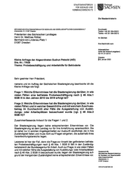 STAATS1V11N1STER1UM F r eis t aat FÜR SOZ1ALES UND SACHSEN VERBRAUCHERSCHUTZ Di e St aat em i n i s t er i n SÄCHSISCHES STMTSMINISTERIUM FOR SOZIALES UND GESELLSCHAFTLICHEN ZUSAMMENHALT Durchwahl Albertstraße 10 I 01097 Dresden Telefon +49 351 564-55001 Telefax +49 351 564-55010 Präsidenten des Sächsischen Landtages Herrn Dr. Matthias Rößler Ihr Zei chen Bernhard-von-Lindenau-Platz 1 01067 Dresden l hre Nachrl cht vom Aktenzel chen (bItte bel Antwort angeben) 43-141.51-20/15 Dresden, Kleine Anfrage der Abgeordneten Gudrun Petzold (AfD) Januar 2020 Drs.-Nr.: 71925 Thema: Probebeschäftigung und Arbeitshilfe für Behinderte Sehr geehrter Herr Präsident, namens und im Auftrag der Sächsischen Staatsregierung beantworte ich die Kleine Anfrage wie folgt: Frage 1: Welche Erkenntnisse hat die Staatsregierung darüber, in wie vielen Fällen eine befristete Probebeschäftigung nach § 46 Abs.1 SGB III in den Jahren 2010 bis 2019 erfolgt ist? Frage 2: Welche Erkenntnisse hat die Staatsregierung darüber, in wie vielen Fällen und in welcher Gesamthöhe und mit welchem Zuschuss- betrag im Durchschnitt aller Fälle die Ausgestaltung von Ausbil- dungs- oder Arbeitsplätzen bezuschusst w urde (vgl. § 46 Abs.2 SGB III)? Zusammenfassende Antwort für die Fragen 1 und 2: Der Staatsregierung liegen keine entsprechenden Erkenntnisse vor. Die Staatsregierung ist dem Landtag nur für ihre Amtsführung verantwortlich. Sie ist daher nur in solchen Angelegenheiten zur Auskunft verpflichtet, die in ihre Zuständigkeit fallen und muss nicht auf Fragen eingehen, die außerhalb ihres Verantwortungsbereichs liegen. Letzteres ist hier der Fall, denn die Frage zur Anzahl der geförderten befriste- ten Probebeschäftigungen nach § 46 Abs. 1 SGB Ill fällt in den Zuständig- keitsbereich der Bundesagentur für Arbeit. Auch zur Frage, in wie vielen Fällen und mit welcher Höhe die Ausgestaltung von Ausbildungs- oder Arbeitsplätzen Hausanschrlft: nach § 46 Abs. 2 SGB Ill bezuschusst wurde, liegen der Staatsregierung auf- Sachslaches StastsmInIsterlum grund der mangelnden Zuständigkeit keine entsprechenden Erkenntnisse vor. für Sozlales und Gesellschaft11- chen Zusammenhalt Albertstraße 10 01097 Dresden www.sms.sachsen.de