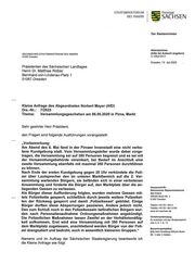 STAATSMINlSTERlUNI Freistaat DES INNERN SACHSEN Der Staatsminister Aktenzeichen SÄCHSISCHES STAATSMINISTERIUM DES INNERN (bitte bei Antwort angeben) 01095 Dresden 3-1053/101/1 Dresden, 13. Juli 2020 Präsidenten des Sächsischen Landtages Herrn Dr. Matthias Rößler Bernhard-von-Lindenau-Platz 1 01067 Dresden Kleine Anfrage des Abgeordneten Norbert Mayer (AfD) Drs.-Nr.: 7/2523 Thema: Versammlungsgeschehen am 06.05.2020 in Pirna, Markt Sehr geehrter Herr Präsident, den Fragen sind folgende Ausführungen vorangestellt: „Vorbemerkung: Am Abend des 6. Mai fand in der Pirnaer lnnenstadt eine nicht verbo- tene Kundgebung statt. Vom Versammlungsleiter wurde dabei vorge- tragen, die Versammlung sei auf 350 Personen begrenzt und es sei mit der Versammlungsbehörde vereinbart, bei Bedarf im Anschluß eine zweite Versammlung ebenfalls mit maximal 350 Personen durchführen zu können. Nach Ende der ersten Kundgebung gegen 20 Uhr verkündete die Poli- zei über Lautsprecher den im unteren Marktbereich auf die 2. Ver- sammlung wartenden Bürgern, sie befänden sich in einer verbotenen Ansammlung und forderte die Bürger auf, den Marktplatz über die an- Hausanschrift: liegenden Gassen zu verlassen. Sächsisches Staatsministerium Als Bürger dieser Aufforderung folgten, wurden mehrere Gassen mit- des Innern WilheIm-Buck-Str. 2 tels Polizeikette gesperrt, schließlich durch jeweils weitere Polizeiket- 01097 Dresden ten der Rückweg gesperrt und damit ‚Polizeikessel‘ gebildet. Einige Bürger durften diese Absperrungen passieren, Andere jedoch nicht. Telefon +49 351 564-0 Telefax +49 351 564-3199 Den zum Schluß noch in den Polizeikesseln befindlichen Bürgern wur- www.smi.sachsen.de den nach Personalienaufnahme Ordnungsmaßnahmen angekündigt. Verkehrsanbindung: Die Polizeilichen Maßnahmen lassen Zweifel an der Verhältnismäßig- Zu erreichen mit den Straßenbahnli— keit aufkommen. Erst wird eine Versammlung mit 350 Personen auf nien 3, 6. 7, 8, 13 dem Marktplatz zugelassen, anschließend werden Bürger von der Poli- Besucherparkplätze: zei drangsaliert und bedroht, auch in wesentlich kleineren Gruppen.“ Bitte beim Empfang Wilhelm-Buck- Str. 2 oder 4 melden. Namens und im Auftrag der Sächsischen Staatsregierung beantworte ich die Kleine Anfrage wie folgt: