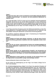 STAATSMiNiSTERiUM Freistaat DES iNNERN [ „ SACHSEN Frage 1: Wer legte wann fest, daß in locker mit Abstand auf dem Markt stehenden Bürgern „verbotene Ansammlungen“ zu erkennen und daß polizeiliche Maßnahmen zu ergreifen sind? Am 6. Mai 2020 gegen 19:30 Uhr wurde durch die zuständige Versammlungsbehörde festgestellt, dass es sich bei den auf dem Markt Anwesenden um keine Versammlung handelt, da der Versammlungsleiter der zuvor stattgefundenen Versammlung diese für beendet erklärt hatte und keine Anschlussversammlung beabsichtigte. Auf die Antwort der Staatsregierung auf die Frage 5 der Kleinen Anfrage Drs.-Nr. 7/2317 wird verwie— sen. In der Folge wurde diese Gruppierung durch die Infektionsschutzbehörde und den Poli- zeivollzugsdienst als „untersagte Ansammlung“ entsprechend der zum Zeitpunkt 6. Mai 2020 gültigen Fassung der Sächsischen Corona-Schutz-Verordnung gewertet. Die getroffenen polizeilichen Maßnahmen lagen in Verantwortung der Polizeidirektion Dresden als einsatzführende Dienststelle. Frage 2: Warum drängte die Polizei diese Bürger zusammen, so daß die durch Corona- Schutz-Verordnung geforderten Abstände nicht mehr eingehalten werden konn- ten? Frage 3: Wie wurde die vom Gesetz vorgeschriebene Prüfung der Verhältnismäßigkeit für jede einzelne Maßnahme vorgenommen und wer war wann für welche Prüfung verantwortlich? Frage 4: Wurde jeweils geprüft, ob ein minderschwerer Eingriff in die Grundrechte der Bürger zur Durchsetzung des Infektionsschutzes ausreichend sei, etwa Ansagen über Lautsprecher an die Bürger, zur Vorsicht Sicherheitsabstände einzuhalten? Frage 5: Welche Maßnahmen wurden geprüft und verworfen, die die einzelne Person und die Allgemeinheit voraussichtlich weniger beeinträchtigen würden? Zusammenfassende Antwort auf die Fragen 2 bis 5: Auf die Antwort der Staatsregierung auf die Frage 5 der Kleinen Anfrage Drs.-Nr. 7/2317 wird verwiesen. Die Verhältnismäßigkeitsprüfung erfolgte für die Dauer des gesamten Einsatzes auf Grundlage des Sächsischen Polizeivollzugsdienstgesetzes durch den Polizeivollzugs- dienst. Das Angebot, die Versammlung für die Personen zu wiederholen, welche vorher wegen infektionsschutzrechtlichen Beschränkungen nicht teilgenommen hatten, wurde seitens des Versammlungsleiters nicht angenommen. Den Teilnehmern der verbotenen Ansammlung wurde mehrfach mittels Lautsprecherdurchsagen erklärt, dass diese sich Seite 2 von 3