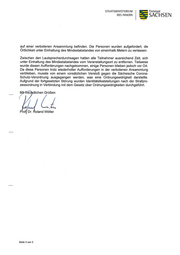 STAATSMINISTERIUM Freistaat DES INNERN SACH SEN a__uf einer verbotenen Ansammlung befinden. Die Personen wurden aufgefordert, die Ortlichkeit unter Einhaltung des Mindestabstandes von eineinhalb Metern zu verlassen. Zwischen den Lautsprecherdurchsagen hatten alle Teilnehmer ausreichend Zeit, sich unter Einhaltung des Mindestabstandes vom Veranstaltungsort zu entfernen. Teilweise wurde diesen Aufforderungen nachgekommen, einige Personen blieben jedoch vor Ort. Da diese Personen trotz wiederholter Aufforderungen in der verbotenen Ansammlung verblieben, musste von einem vorsätzlichen Verstoß gegen die Sächsische Corona- Schutz—Verordnung ausgegangen werden, was eine Ordnungswidrigkeit darstellte. Aufgrund der fortgesetzten Störung wurden ldentitätsfeststellungen nach der Strafpro- zessordnung in Verbindung mit dem Gesetz über Ordnungswidrigkeiten durchgeführt. _ /u»freu dlichen Grüßen Prof Dr. ioland Wöller Seite 3 von 3