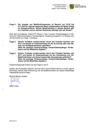 Der Staatsminister Sächsisches Staatsministerium für Wirtschaft, Arbeit und Verkehr Durchwahl Postfach 10 03 29 | 01073 Dresden Telefon: 0351 564-80001 Telefax: 0351 564-80080 Präsidenten des Sächsischen Landtages Aktenzeichen (bitte bei Antwort angeben) Herrn Dr. Matthias Rößler PKL-1053/87/2-2019/62793 Bernhard-von-Lindenau-Platz 1 Dresden, 14. November 2019 01067 Dresden Kleine Anfrage des Abgeordneten André Wendt (AfD) Drs.-Nr.: 7/283 Thema: Ausbauplanungen des 5G-Mobilfunkes in Sachsen Sehr geehrter Herr Präsident, namens und im Auftrag der Sächsischen Staatsregierung beantworte ich die Kleine Anfrage wie folgt: Frage 1: Wo wird derzeitig und voraussichtlich bis zum Ende des Jahres 2020 ein 5G-Mobilfunksender eingerichtet? (Bitte nach Standorten aufschlüsseln, dabei unterscheiden zwischen Sendeanlagen mit einer Gesamtsendeleistung von 10 Watt EIRP oder mehr und Sendeanlagen mit einer Ge- samtsendeleistung von unter 10 Watt EIRP.) Nach dem Grundgesetz, Artikel 87f, Absatz 2, Satz 1 werden Telekommuni- kationsdienstleistungen als privatwirtschaftliche Tätigkeiten durch die aus dem Sondervermögen Deutsche Bundespost hervorgegangenen Unterneh- men und durch andere private Anbieter eigenverantwortlich erbracht. Ge- Hausanschrift naue Standorte sowie die unternehmensinternen Planungen sind als Ge- Sächsisches Staatsministerium schäftsgeheimnisse der im Wettbewerb zueinander stehenden Telekommu- für Wirtschaft, Arbeit und Verkehr nikationsunternehmen anzusehen. Wilhelm-Buck-Straße 2 01097 Dresden Demzufolge umfassen die nachfolgenden Ausführungen nur diejenigen 5G-Mobilfunksender, welche direkt durch sächsische Staatsministerien oder Außenstelle deren unmittelbar nachgeordneten Geschäftsbereich aufgebaut werden. Zu Ammonstraße 10 01069 Dresden berücksichtigen ist hier jedoch, dass damit kein kommerzieller Netzbetrieb im Sinne des o.g. Artikel 87f des Grundgesetzes verbunden ist, sondern dass Forschung und Erprobung im Fokus des Netzbetriebs stehen. www.smwa.sachsen.de Das Landesamt für Umwelt, Landwirtschaft und Geologie und die Techni- Verkehrsanbindung: sche Universität Dresden planen am Standort des Lehr- und Versuchsgutes Zu erreichen mit den Straßenbahnlinien Köllitsch den Aufbau von 5G-Basisstationen bis Ende 2020, die im landwirt- 3, 7, 8, 9 - Haltestelle Carolaplatz schaftlichen Bereich Erprobungen durchführen werden. Über die Sendeleis- * Information zum Zugang für ver- tungen kann derzeit noch keine Aussage getroffen werden. schlüsselte elektronische Dokumente unter www.smwa.sachsen.de/kontakt.htm poststelle@smwa-sachsen. Seite 1 von 2 de-mail.de