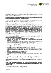 STAATSM1N1STER11JM FÜR SOZ1ALES Freistaat UND GESELLSCHAFTUCHEN SACHSEN ZUSAMMENHALT 55860). Außerdem gibt es Pressem itteilungen des SMS und Pressek onferenzen der Staatsregierung zum Them a SARS-CoV-2 und C0VID19, die für eine sachliche Inform a- tion der Bevölk erung genutzt werden. Fr a g e 3: Mi t w el c h en m ö g l i c h en Szen a r i en r ec h n et d i e St a a t s r eg i er u n g u n d w el c h e Hand lung sem p f ehlung en w er d en d ar aus ab g eleit et ? Aufgrund der sehr dynam ischen Entwick lung hinsichtlich des Erk rank ungsgeschehens COVID-19 sind die erforderlichen Maßnahm en laufend anzupassen. Die Staatsregierung trifft Maßnahm en in enger Abstim m ung m it den Bundesbehörden und den Behörden der anderen Bundesländer unter Berück sichtigung der unterschiedli- chen regionalen Situation der Betroffenheit durch COVID-19. Bisher wurden zunächst größere Veranstaltungen abgesagt. Die Notfallpläne der Krank enhäuser k om m en zurn Einsatz. Außerdem sind die Krank enhäuser aufgefordert, planbare Aufnahm en auf un- b e s t im m t e Z e it zu ve r s c hie b e n, um s ic h a uf d e n e r wa r t b a r s t e ig e nd e n B e d a r f a n Int e ns iv- und Beatm ungsk apazitäten zur Behandlung von Patienten m it schweren Atem wegser- k rank ungen durch COVID-19 vorbereiten zu k önnen — siehe auch Antwort zu Drs.-Nr. 7/1791. Um die gesundheitliche Versorgung zu sichern, werden derzeit Maßnahm en der sozialen Distanzierung um gesetzt. Um die Verbreitung des COVID-19 einzudäm m en hat die Staatsregierung bereits fol- gende Allgem einverfügungen erlassen: - Erlass zum Umgang mit Großveranstaltungen vom 10. März 2020, - Aufhebung der Schulpflicht und Einstellung des Kindertagesstätten- und Schulbe- triebs vom 16. März 2020, - Betretungsverbot in stationären Einrichtungen der Kunder- und Jugendhilfe sowie der Eingliederungshilfe für Kinder und Jugendliche vom 19. März 2020, - Betretungsverbot in Alten- und Pflegeheimen und Einrichtungen für Menschen mit Be- hinderungen vorn 20. März 2020, - Betretungsverbot für Werkstätten für behinderte Menschen vom 20. März 2020, - Betretungsverbot von Tagespflegeeinrichtungen vom 20. März 2020, - Schutzmaßnahmen an Krankenhäusern und stationären medizinischen Rehabilitati- onseinrichtungen zur Verhinderung der Verbreitung des Corona-Virus vom 20. März 2020, - Verbot von Veranstaltungen vom 20. März 2020, - Ausgangsbeschränkungen vom 22. März 2020, - Einstellung des Betriebs von Schulen und Kindertageseinrichtungen vom 23. März 2020. Frage 4: Wie werden die Gesundheitsämter in die Überlegungen einbezogen und ist der ÖGD in Sachsen ausreichend personell und finanziell ausgestattet, um im Falle einer solchen Epidemie entsprechende Handlungsanweisungen umsetzen zu können? Frage 5: 1st es oeplant, angesichts der unübersichtlichen Situation bezüglich SARS Cov2 den OGD zeitnah zu stärken, damit er entsprechende Aufgaben über- nehmen kann? Zusarnmenfassende Antwort auf die Fragen 4 und 5: Seite 2 von 3