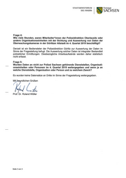 STAATSNHNISTERIUM Freista at DES ]NNERN SACHSEN Frage 4: Wie viele Stunden, waren Mitarbeiter*innen der Polizeidirektion Oberlausitz oder andere Organisationseinheiten mit der Sichtung und Auswertung von Daten der UbenNachungskameras in der Görlitzer Altstadt im 4. Quartal 2019 beschäftigt? Derzeit ist ein Bediensteter der Polizeidirektion Görlitz zur Auswertung der Daten im Sinne der Fragestellung befugt. Die Auswertung solcher Daten ist integraler Bestandteil polizeilicher Ermittlungen. Diesbezügliche Arbeitsaufwände werden daher statistisch nicht erfasst. Frage 5: Wurden Daten an nicht zur Polizei Sachsen gehörende Dienststellen, Organisati- onseinheiten oder Personen im 4. Quartal 2019 weitergegeben und wenn ja an welche Dienststelle, Organisation oder Person und zu welchem Zweck? Es wurden keine Datensätze an Dritte im Sinne der Fragestellung weitergegeben. ?ndlichen Grüßen Prof. Dr. Roland Wöller Seite 3 von 3