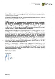 STAATSMINISTERiUM ; 1— Freistaat DES iNNERN LL. ff: SACH SEN Schutz Dritter nur dann hinreichend gewährleistet werden können, wenn die Informa— tionsübermittlung unterbleibt. Es wird darauf hingewiesen, dass der Parlamentarischen Kontrollkommission auf deren Verlangen weitergehende Auskunft erteilt wird. Frage 5: Wieviel Personen, die aus islamistischen Kampfgebieten (Syrien, Afghanistan, Irak etc.) in den Freistaat Sachsen zurückkehrten, und wie viele ihrer Angehöri- gen wurden —in welchem Umfang und welchem Zeitraum- durch die Koordinie- rungs- und Beratungsstelle Radikalisierungsprävention (KORA) und ggf. weitere kooperierende Beratungsträger beraten und betreut und welche konkreten Maß- nahmen wurden in diesem Zusammenhang durchgeführt? Bislang wurden weder Personen, die aus islamistischen Kampfgebieten in den Frei— staat Sachsen zurückkehrten, noch deren Angehörige durch die KORA beraten bzw. betreut. Die Beratung bzw. Betreuung von zwei in der Kleinen Anfrage Drs.-Nr. 6/16988 genannten Personen, von deren jeweiligen Angehörigen sowie von den Angehörigen einer dritten in selbiger Drucksache genannten Person erfolgte bzw. erfolgt durch den Beratungsträger HAYAT Deutschland, mit dem die KORA anlass- und fallbezogen ko- operiert. Da dieser Beratungsträger jedoch nicht durch die KORA bzw. das Staatsmi- nisterium für Soziales und Gesellschaften Zusammenhalt (SMS) gefördert wird, liegen der KORA bzw. dem SMS keine Erkenntnisse bezüglich des Umfangs und des Zeit- raums dieser Beratungen bzw. Betreuungen vor. In Bezug auf einen dieser 0. 9. Fälle kooperierte die KORA bislang dahingehend, dass sie auf Wunsch von HAYAT Deutschland im Jahr 2018 zu zwei sogenannten Runden Tischen eingeladen hat, um mit dem Beratungsträger und weiteren kommunalen und sicherheitsbehördlichen Akteuren die Rückkehr dieser Person in den Freistaat Sachsen bestmöglich vorbereiten zu können. Mit freundlichen Grüßen in Vertretung Seite 3 von 3