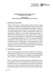 STAATSMINISTERIUM Freistaat FÜR WIRTSCHAFT SACHSEN ARBEIT UND VERKEHR Europäischer Sozialfonds im Freistaat Sachsen Förderzeitraum 2014 bis 2020 Anleitung Nr. 28 Verfahrensänderungen zur Bewältigung der Corona-Krise A. Übergreifende Vorgehensweise Soweit im Fördervollzug ein Ermessensspielraum besteht, ist dieser im Zusam- menhang mit der aktuellen Sondersituation großzügig auszulegen. Gleiches gilt für die Regelung von Ausnahmen, die der Bewältigung der Krise dienen. Vorhaben, die bereits bewilligt wurden, können unterbrochen und soweit möglich zu einem späte- ren Zeitpunkt fortgesetzt werden. Es sollten nach Möglichkeit die Fortsetzung vor- habensbezogener Tätigkeiten oder eine spätere Fortsetzung/kostenneutrale Ver- längerung der Vorhaben geprüft werden, um die gesetzten Ziele der Vorhaben zu erreichen. Sofern die Auswirkungen von Unterbrechungen durch Alternativangebote (z. B. sozialpädagogische Begleitung per Telefon oder Internet, projektbezogene „Hausaufgaben") verringert werden können, ist dies im Rahmen der Ermes- sensausübung positiv zu berücksichtigen. Die zuwendungsrechtlichen Vorgaben wie auch der Grundsatz der Wirtschaftlichkeit und Sparsamkeit sind bei allen Ent- scheidungen weiterhin zu beachten. Eine hinreichende Dokumentation getroffener Entscheidungen zur späteren Nachvollziehbarkeit ist erforderlich. B. Förderfähigkeit von Ausgaben Sofern durch Alternativangebote mit dem Ziel der Weiterführung der Vorhaben zu- sätzliche Ausgaben entstehen, können diese auf Antrag der Zuwendungsempfän- ger vorbehaltlich der Förderfähigkeit und der verfügbaren Haushaltsmittel gefördert werden. Durch den Zuwendungsempfänger ist ein Änderungsantrag zu stellen. Sofern im Einzelfall durch den Zuwendungsempfänger Verpflichtungen für Ausga- ben eingegangen wurden, die für die Erreichung des Zuwendungszwecks erforder- lich gewesen wären, sich der Zuwendungszweck aber aufgrund der Auswirkungen des Corona-Virus nicht mehr erreichen lässt oder die weitere Verfolgung des Zu- wendungszwecks objektiv nicht mehr sinnvoll ist, bleiben die nachweislich entstan- Seite 3 von 5