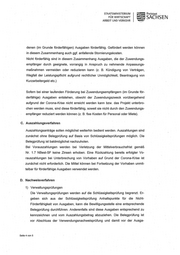STAATSMINISTERIUM Freistaat FÜR WIRTSCHAFT SACHSEN ARBEIT UND VERKEHR denen (im Grunde förderfähigen) Ausgaben förderfähig. Gefördert werden können in diesem Zusammenhang auch ggf. anfallende Stornierungskosten. Nicht förderfähig sind in diesem Zusammenhang Ausgaben, die der Zuwendungs- empfänger durch geeignete, vorrangig in Anspruch zu nehmende Anpassungs- maßnahmen vermeiden oder reduzieren kann (z. B. Kündigung von Verträgen, Wegfall der Leistungspflicht aufgrund rechtlicher Unmöglichkeit, Beantragung von Kurzarbeitergeld etc.) Sofern bei einer lauienden Förderung bei Zuwendungsempfängern (im Grunde för- derfähige) Ausgaben entstehen, obwohl der Zuwendungszweck vorübergehend aufgrund der Corona-Krise nicht erreicht werden kann bzw. das Projekt unterbro- chen werden muss, sind diese förderfähig, soweit sie nicht durch den Zuwendungs- empfänger reduziert werden können (z. B. fixe Kosten für Personal oder Miete). C. Auszahlungsverfahren Auszahlungsanträge sollen möglichst weiterhin bedient werden. Auszahlungen sind zunächst ohne Belegprüfung auf Basis von Schlüssigkeitsprüfungen möglich. Die Belegprüfung ist baldmöglichst nachzuholen. Bei Vorauszahlungen werden bei Verletzung der Mittelverbrauchsfrist gemäß Nr. 1.7 NBest-SF keine Zinsen erhoben. Eine Rückzahlung bereits erfolgter Vo- rauszahlungen bei Unterbrechung von Vorhaben auf Grund der Corona-Krise ist zunächst nicht erforderlich. Die Mittel können bei Fortsetzung der Vorhaben unmit- telbar für förderfähige Ausgaben verwendet werden. D. Nachweisverfahren 1) Verwaltungsprüfungen Die Verwaltungsprüfungen werden auf die Schlüssigkeitsprüfung begrenzt. Er- geben sich aus der Schlüssigkeitsprüfung Anhaltspunkte für die Nicht- Förderfähigkeit von Ausgaben, kann die Bewilligungsstelle eine entsprechende Belegprüfung durchführen. Anderenfalls sind diese Ausgaben entsprechend zu kennzeichnen und vom Auszahlungsbetrag abzuziehen. Die Belegprüfung ist vor Abschluss der Verwendungsnachweisprüfung und damit vor der Ausga- Seite 4 von 5