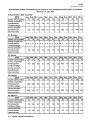Anlage zu Drs.-Nr. 7/1121 Polizeiliche Einsätze zur Begleitung von Großraum- und Schwertransporten (GST) im Freistaat Sachsen im Jahr 2019 Polizeidirektion (PD) Chemnitz 2019 Jan. Feb. Mrz. Apr. Mai Jun. Jul. Aug. Sep. Okt. Nov. Dez. AnzahIGST—Einsätze 27 32 48 65 60 42 24 53 40 46 51 51 hierbei eingesetzte Polizeibeamte/ 63/1 83 156 136 147 101 73/1 161102/2131/3165/2 131 Tarifbeschäfitgte hierbei geleistete Einsatzstunden 55 74 193 156 177 110 51 158 110 97 164 100 (Mannstunden) PD Dresden 2019 Jan. Feb. Mrz. Apr. Mai Jun. Jul. Aug. Sep. Okt. Nov. Dez. AnzahlGST-Einsätze 31 29 42 36 50 82 75 85 58 53 79 37 hierbei eingesetzte Polizeibeamte/ k,E. k.E. k.E. k.E. k.E. k.E. k.E. k.E. k.E. k.E. k.E. k.E. Tarifbeschäfitgte hierbei geleistete Einsatzstunden 59 69 84 69 90 175 170 160 119 78 142 51 (Mannstunden) PD Görlitz 2019 Jan. Feb. Mrz. Apr. Mai Jun. Jul. Aug. Sep. Okt. Nov. Dez. AnzahIGST—Einsätze 25 24 36 42 68 36 61 66 81 96 73 43 hierbei eingesetzte Polizeibeamte! 70 55 85 84 130 72 122 151 169 198 144 86 Tarifbeschäfitgte hierbei geleistete Einsatzstunden 33 91 63 70 87 61 97 71 95 132 137 116 (Mannstunden) PD Leipzig 2019 Jan. Feb. Mrz. Apr. Mai Jun. Jul. Aug. Sep. Okt. Nov. Dez. AnzahlGST-Einsätze 57 42 55 42 44 47 42 61 74 91 89 62 hierbei eingesetzte Polizeibeamte! 168 126 180 133 127 170 127 187 232 234 231 169 Tarifbeschäfitgte hierbei geleistete Einsatzstunden 244 152 277 171 187 283 108 365 103 338 302 224 (Mannstunden) PD Zwickau 2019 Jan. Feb. Mrz. Apr. Mai Jun. Jul. Aug. Sep. Okt. Nov. Dez. AnzahlGST-Einsätze 35 45 44 60 36 29 46 39 66 56 63 38 hierbei eingesetzte Polizeibeamte/ 79 92 90 121 107 59 95 71 121 123 120 76 Tarifbeschäfitgte hierbei geleistete Einsatzstunden 78 104 99 79 82 60 80 65 152 143 127 103 (Mannstunden) k. E. = keine statistische Erfassung