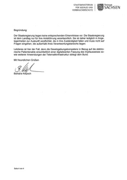 STAATSMlNlSTERlUM Freistaat FÜR SOZlALES UND VERBRAUCHERSCHUTZ SACHSEN Begründung: Der Staatsregierung liegen keine entsprechenden Erkenntnisse vor. Die Staatsregierung ist dem Landtag nur für ihre Amtsführung verantwortlich. Sie ist daher lediglich in Ange- legenheiten zur Auskunft verpflichtet, die in ihre Zuständigkeit fallen und muss nicht auf Fragen eingehen, die außerhalb ihres Verantwortungsbereichs liegen. Letzteres ist hier der Fall, denn die Gesetzgebungskompetenz in Bezug auf die elektro- nische Patientenakte einschließlich einer digitalisierten Fassung des Impfausweises so- wie weiterer Anwendungen der Telematikinfrastruktur obliegt dem Bund. Mit freundlichen Grüßen c3. Barbara Klepsch Seite 4 von 4