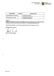 STAATSMINISTERIUM Freistaat DES INNERN SACH SEN Dienststelle Anzahl Absage durch Polizeidirektion Chemnitz 1 sächsische Polizei Polizeidirektion Görlitz 5 SäChS'SChe P°"Ze' (3) polnische Polizei (2) Frage 3: Welche Polizeireviere führen planmäßig mit den polnischen oder tschechischen Polizeidienststellen gemeinsame Streifen im 24 Stundenbetrieb durch? Gemeinsame Streifen im 24-Stunden—Betrieb führt kein Polizeirevier durch. r ndlichen Grüßen MU Prof. D/r. Roland Wöller Seite 2 von 2