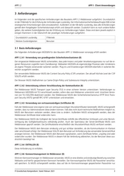 APP.1.2 APP.1: Client-Anwendungen APP.1.2.A11 Überprüfung auf schädliche Inhalte (H) Aufgerufene Internetadressen SOLLTEN durch den Webbrowser auf potenziell schädliche Inhalte geprüft werden. Der Webbrowser SOLLTE den Benutzer warnen, wenn Informationen über schädliche Inhalte vorliegen. Eine als schädlich klassifizierte Verbindung SOLLTE NICHT aufgerufen werden können. Das verwendete Verfahren zur Über- prüfung DARF NICHT gegen Datenschutz- oder Geheimschutz-Vorgaben verstoßen. APP.1.2.A12 Zwei-Browser-Strategie (H) Für den Fall von ungelösten Sicherheitsproblemen mit dem verwendeten Webbrowser SOLLTE ein alternativer Browser mit einer anderen Plattform installiert sein, der dem Benutzer als Ausweichmöglichkeit dient. 4 Weiterführende Informationen 4.1 Wissenswertes • BSI-Veröffentlichung zur Cyber-Sicherheit BSI-CS 047: „Absicherungsmöglichkeiten beim Einsatz von Web- browsern“ • Mindeststandard des BSI für den Einsatz des SSL/ TLS-Protokoll durch Bundesbehörden nach § 8 Abs. 1 Satz 1 BSIG • Mindeststandard des BSI für sichere Webbrowser nach § 8 Absatz 1 Satz 1 BSIG • Common Criteria Protection Profile for Remote-Controlled Browsers System (ReCoBS): BSI-PP-0040 5 Anlage: Kreuzreferenztabelle zu elementaren Gefährdungen Die Kreuzreferenztabelle enthält die Zuordnung von elementaren Gefährdungen zu den Anforderungen. Anhand dieser Tabelle lässt sich ermitteln, welche elementaren Gefährdungen durch welche Anforderungen abgedeckt sind. Durch die Umsetzung der aus den Anforderungen abgeleiteten Sicherheitsmaßnahmen wird den entspre- chenden elementaren Gefährdungen entgegengewirkt. Die Buchstaben in der zweiten Spalte (C = Vertraulichkeit, I = Integrität, A = Verfügbarkeit) zeigen an, welche Grundwerte der Informationssicherheit durch die Anforderung vorrangig geschützt werden. Die folgenden elementaren Gefährdungen sind für den Baustein APP.1.2 Webbrowser von Bedeutung. G 0.14 Ausspähen von Informationen (Spionage) G 0.15 Abhören G 0.18 Fehlplanung oder fehlende Anpassung G 0.19 Offenlegung schützenswerter Informationen G 0.22 Manipulation von Informationen G 0.23 Unbefugtes Eindringen in IT-Systeme G 0.26 Fehlfunktion von Geräten oder Systemen G 0.28 Software-Schwachstellen oder -Fehler G 0.30 Unberechtigte Nutzung oder Administration von Geräten und Systemen G 0.39 Schadprogramme IT-Grundschutz-Kompendium: Stand Februar 2021 5