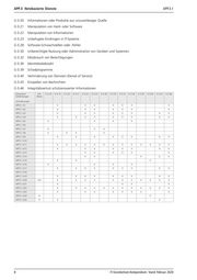 APP.3: Netzbasierte Dienste APP.3.1 G 0.20 Informationen oder Produkte aus unzuverlässiger Quelle G 0.21 Manipulation von Hard- oder Software G 0.22 Manipulation von Informationen G 0.23 Unbefugtes Eindringen in IT-Systeme G 0.28 Software-Schwachstellen oder -Fehler G 0.30 Unberechtigte Nutzung oder Administration von Geräten und Systemen G 0.32 Missbrauch von Berechtigungen G 0.36 Identitätsdiebstahl G 0.39 Schadprogramme G 0.40 Verhinderung von Diensten (Denial of Service) G 0.43 Einspielen von Nachrichten G 0.46 Integritätsverlust schützenswerter Informationen Elementare CIA- G 0.18 G 0.19 G 0.20 G 0.21 G 0.22 G 0.23 G 0.28 G 0.30 G 0.32 G 0.36 G 0.39 G 0.40 G 0.43 G 0.46 Gefährdungen Werte Anforderungen APP.3.1.A1 X X X X X X X APP.3.1.A2 X X X X X X X APP.3.1.A3 X X X X X X X X APP.3.1.A4 X X X X X X X X X APP.3.1.A5 X X X X APP.3.1.A6 APP.3.1.A7 X X X APP.3.1.A8 X X X X APP.3.1.A9 X X X X X X X X APP.3.1.A10 APP.3.1.A11 X X X X X X X X X X X X X APP.3.1.A12 X X X X X X X X APP.3.1.A13 X X X X X X APP.3.1.A14 X X X X X APP.3.1.A15 X X X APP.3.1.A16 X X X X APP.3.1.A17 X X X X X X X X X APP.3.1.A18 APP.3.1.A19 X X X X X X X X X APP.3.1.A20 CIA X X X X X X X X X X X APP.3.1.A21 X X X X APP.3.1.A22 X X X X X X X X X X X X APP.3.1.A23 X X X X X X X X APP.3.1.A24 A X APP.3.1.A25 CI X X 8 IT-Grundschutz-Kompendium: Stand Februar 2020