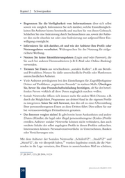 Kapitel 2 Schwerpunkte • Begrenzen Sie die Verfügbarkeit von Informationen über sich selbst soweit wie möglich. Informieren Sie sich darüber, welche Einstellmöglich- keiten Ihr Anbieter hierzu bereitstellt, und machen Sie von ihnen Gebrauch. Schließen Sie eine Indexierung durch Suchmaschinen aus, soweit der Anbie- ter dies nicht ohnehin tut oder eine Indexierung nur aufgrund Ihrer Ein- willigung ermöglicht. • Informieren Sie sich darüber, ob und wie der Anbieter Ihre Profil- oder Nutzungsdaten verarbeitet. Widersprechen Sie der Nutzung für zielge- richtete Werbung. • Nutzen Sie keine Identifizierungsdaten (Login und/oder Passwort), die Sie auch bei anderen Diensteanbietern (z.B. E-Mail oder Online-Banking) verwenden. • Trennen Sie Daten aus verschiedenen „sozialen Rollen“, z.B. aus Berufs- und Privatleben. Nutzen Sie dafür unterschiedliche Profile oder Plattformen unterschiedlicher Anbieter. • Viele Anbieter privilegieren bei den Einstellungen für Zugriffsbefugnisse Dritter auf Profildaten „registrierte Freunde“ in starkem Maße. Überlegen Sie, bevor Sie eine Freundschaftseinladung bestätigen, ob Sie der betref- fenden Person wirklich all diese Daten zugänglich machen wollen. • Soziale Netzwerke öffnen sich immer mehr für andere Web-Dienste, z. B. durch die Möglichkeit, Programme aus dritter Hand in die eigenen Profile zu integrieren. Seien Sie sich bewusst, dass dies oft zu einer Übermittlung Ihrer personenbezogenen Daten an diese Dritten führt. Dies sollten Sie nur bei vertrauenswürdigen Drittanbietern gestatten. • Das Internet vergisst nichts! Es gibt bereits heute Auskunfteien und andere (Daten-)Händler, die legal oder illegal personenbezogene (Risiko-)Profile erstellen. Anbieter sozialer Netzwerke können nicht verhindern, dass auch veraltete Inhalte der selbst angelegten Profile in diesen Profilen auftauchen. Interessenten können Personalverantwortliche in Unternehmen, Banken oder Versicherungen sein. Mit dem Anbieter der Sozialen Netzwerke „SchülerVZ“, „StudiVZ“ und 37 „MeinVZ“, die wir überprüft haben, wurden Ergebnisse erzielt, die die Nut- zenden in die Lage versetzen, ihre Daten in ausreichendem Maß zu schützen, 37 JB 2007, 12.3; JB 2006, 10.2.4 Jahresbericht BlnBDI 2008 38