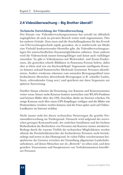 Kapitel 2 Schwerpunkte 2.4 Videoüberwachung – Big Brother überall? Technische Entwicklung der Videoüberwachung Der Einsatz von Videoüberwachungssystemen hat sowohl im öffentlich zugänglichen als auch im privaten Bereich weiter stark zugenommen. Dies hat mehrere Gründe: Zum einen sind die Anschaffungskosten für den Erwerb von Überwachungstechnik rapide gesunken, da es mittlerweile am Markt eine Vielzahl konkurrierender Hersteller gibt, die Videoüberwachungsan- lagen für unterschiedlichste Einsatzmöglichkeiten anbieten. Zum anderen wird die Videotechnik immer leistungsfähiger und damit auch vielfältiger einsetzbar. So gibt es Videokameras mit Weitwinkel- und Zoom-Funkti- onen, die gestochen scharfe Bilddaten in Panorama-Format liefern, dabei aber so klein sind wie ein Stecknadelkopf. Sogenannte intelligente Kame- ras können anhand biometrischer Merkmale bestimmte Personen identifi- zieren. Andere wiederum erkennen vom normalen Bewegungsablauf eines beobachteten Menschen abweichende Bewegungen (z. B. schnelles Laufen, Sturz, schwankender Gang usw.) und speichern nur diese Sequenzen zur späteren Auswertung. Darüber hinaus schreitet die Vernetzung von Kameras und Kamerasystemen weiter voran. Immer mehr Kameras besitzen inzwischen eine WLAN-Funktion und können Bilder über den DSL-Anschluss direkt ins Internet schicken. Da einige Kameras auch über einen GPS-Empfänger verfügen und die Bilder mit Positionsdaten versehen werden können, sind die Fotos später auch auf Online- Landkarten im Internet sichtbar. Nicht immer steht bei diesen technischen Neuerungen die gezielte Per- sonenüberwachung im Vordergrund. Dennoch wird aufgrund des inzwi- schen geringen Kostenaufwands, der einfachen Installation und der leichten Bedienbarkeit das Beobachten von Personen mit Kameras immer attraktiver. Bedingt durch die enorme Vielfalt der technischen Möglichkeiten werden oftmals die Persönlichkeitsrechte der beobachteten Personen nicht berück- sichtigt und treten in den Hintergrund. In vielen Fällen verschwimmen bei- spielsweise die Grenzen zwischen der Darstellung allgemeiner Landschafts- aufnahmen, auf denen Menschen nur als „Beiwerk“ zu sehen sind, und dem gezielten Voyeurismus und Ausspionieren von Verhaltensmustern betroffe- ner Personen. Jahresbericht BlnBDI 2008 44