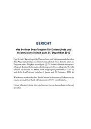 BERICHT des Berliner Beauftragten für Datenschutz und Informationsfreiheit zum 31. Dezember 2010 Der Berliner Beauftragte für Datenschutz und Informationsfreiheit hat dem Abgeordnetenhaus und dem Senat jährlich einen Bericht über das Ergebnis seiner Tätigkeit vorzulegen (§§ 29 Berliner Datenschutzgesetz, 18 Abs. 3 Berliner Informationsfreiheitsgesetz). Der vorliegende Bericht schließt an den am 31. März 2010 vorgelegten Jahresbericht 2009 an und deckt den Zeitraum zwischen 1. Januar und 31. Dezember 2010 ab. Wiederum werden die über Berlin hinaus bedeutsamen Dokumente in einem gesonderten Band („Dokumente 2010“) veröffentlicht. Dieser Jahresbericht ist über das Internet (www.datenschutz-berlin.de) abrufbar.