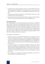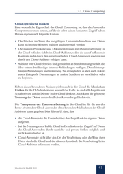 2.1 Cloud Computing Cloud-spezifische Risiken Eine wesentliche Eigenschaft des Cloud Computing ist, dass die Anwender Computerressourcen nutzen, auf die sie selbst keinen konkreten Zugriff haben. Daraus ergeben sich folgende Risiken: • Das Löschen im Sinne des endgültigen Unkenntlichmachens von Daten kann nicht ohne Weiteres realisiert und überprüft werden. • Die meisten Protokolle und Dokumentationen zur Datenverarbeitung in der Cloud befinden sich beim Cloud-Anbieter, sodass die darauf aufbauende Kontrolle nicht durch den verantwortlichen Cloud-Anwender, sondern nur durch den Cloud-Anbieter erfolgen kann. • Anbieter von Cloud-Services sind gemeinhin an Standorten angesiedelt, die über extrem breitbandige Internet-Anbindungen verfügen. Diese leistungs- fähigen Anbindungen sind notwendig. Sie ermöglichen es aber auch, in kür- zester Zeit große Datenmengen an andere Standorte zu verschieben oder zu kopieren. Neben diesen besonderen Risiken spielen auch in der Cloud die klassischen Risiken für die IT-Sicherheit eine wesentliche Rolle. So sind z.B. Angriffe mit Schadsoftware auf die Dienste in der Cloud denkbar. Auch kann die gebotene Trennung der Daten unterschiedlicher Anwender gefährdet sein. Die Transparenz der Datenverarbeitung in der Cloud ist für die aus der Ferne arbeitenden Cloud-Anwender ohne besondere Maßnahmen des Cloud- Anbieters kaum gegeben. Dies führt u.U. dazu, dass • die Cloud-Anwender die Kontrolle über den Zugriff auf die eigenen Daten aufgeben, • bei der Nutzung einer Public Cloud in Drittländern der Zugriff auf Daten des Cloud-Anwenders durch staatliche und private Stellen möglich und nicht kontrollierbar ist, • Cloud-Anwender nicht über den Ort der Verarbeitung oder die Wege ihrer Daten durch die Cloud und die näheren Umstände der Verarbeitung beim Cloud-Anbieter informiert werden, Jahresbericht BlnBDI 2011 41