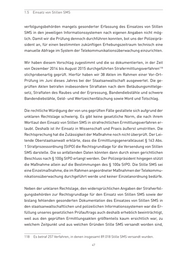 Kapitel 1 Schwerpunkte wer hiervon betroffen war und zu welchen Ergebnissen die Maßnahme jeweils führte. Trotz dieser Schwierigkeiten bei der Durchführung der Prüfung konnten wir fest- stellen, dass es besonders in drei Punkten strukturelle Mängel bei dem Einsatz von Stillen SMS gibt: • Oft setzten die Strafverfolgungsbehörden Stille SMS ein, ohne dass diese Maß- nahmen für die Erforschung des Sachverhalts oder die Ermittlung des Aufent- haltsortes der oder des Beschuldigten erkennbar erforderlich waren. Zudem wurde eine nicht geringe Anzahl dieser Maßnahmen durchgeführt, ohne wei- tere weniger eingreifende Ermittlungsansätze zu prüfen, Ergebnisse bereits durchgeführter Ermittlungen abzuwarten oder zu untersuchen, ob die Maß- nahmen zum Zeitpunkt ihrer Durchführung aufgrund anderer Ermittlungser- gebnisse noch notwendig waren. • Die Staatsanwaltschaft beantragte regelmäßig gerichtliche Beschlüsse für die Durchführung von TKÜ-Maßnahmen oder die Abfrage von Verkehrsdaten, die sie sodann auch für die Versendung von Stillen SMS nutzte. Sie erklärte da- bei nicht, weshalb ohne die konkrete Maßnahme die Erforschung des Sach- verhalts oder die Ermittlung des Aufenthaltsortes der oder des Beschuldigten wesentlich erschwert oder aussichtslos gewesen wäre bzw. warum sie für die Erforschung des Sachverhalts erforderlich war und die Erhebung der Daten in einem angemessenen Verhältnis zur Bedeutung der Sache stand. Weiterhin benannte die Staatsanwaltschaft bei der Beantragung von TKÜ-Maß- nahmen oder der Abfrage von Verkehrsdaten in keinem einzigen der geprüften Fälle den geplanten Einsatz von Stillen SMS und machte es somit dem Gericht unmöglich, die Rechtmäßigkeit genau dieser Maßnahmen zu prüfen. • In der überwiegenden Anzahl der geprüften Fälle fand keine Benachrichtigung der Betroffenen statt bzw. wurden keine Gründe für nicht oder noch nicht er- folgte Benachrichtigungen aktenkundig gemacht, obwohl dies verpflichtend vorgeschrieben ist. Weiterhin war aus dem Großteil der Akten der Einsatz von Stillen SMS nicht ersichtlich. Selbst wenn also Betroffene Kenntnis von der Durchführung von TKÜ-Maßnahmen gegen sie oder von der Abfrage sie betref- 48