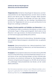 Infothek der Berliner Beauftragten für Datenschutz und Informationsfreiheit Tätigkeitsberichte: Die Berliner Beauftragte für Datenschutz und Infor- mationsfreiheit hat dem Abgeordnetenhaus und dem Senat von Berlin jährlich einen Bericht über ihre Tätigkeit vorzulegen. Neben aktuellen technischen und rechtlichen Entwicklungen wird darin über Schwer- punktthemen und Einzelfälle aus den jeweiligen Geschäftsbereichen berichtet. Der Tätigkeitsbericht wird von uns auch als Broschüre für die Bürgerinnen und Bürger veröffentlicht. Ratgeber, Orientierungshilfen und Faltblätter zum Datenschutz: In die- sen Publikationen haben wir praktische Informationen zu immer wieder auftretenden Fragen im Alltag zusammengestellt. Damit wollen wir die Menschen in die Lage versetzen, ihre Datenschutzrechte bzw. ihr Recht auf Informationszugang eigenständig wahrzunehmen. Gesetzestexte: Datenschutz-Grundverordnung, Bundesdatenschutzge- setz und Berliner Datenschutzgesetz in aktualisierter bzw. neu gefasster Ausgabe. Standpunkt: Datenschutzrechtliche bzw. datenschutzpolitische Positi- onierung der Beauftragten für Datenschutz und Informationsfreiheit zu einem konkreten Sachverhalt. Kurzpapiere: Die Europäische Datenschutz-Grundverordnung (DS-GVO) wird am 25. Mai 2018 wirksam. Die Aufsichtsbehörden befassen sich zur- zeit intensiv mit den neuen Rechtsgrundlagen und deren Anforderungen und stimmen eine einheitliche Sichtweise ab. Erste Ergebnisse dieses Prozesses sind gemeinsame Kurzpapiere zur DS-GVO, die die Konferenz der unabhängigen Datenschutzbehörden des Bundes und der Länder (DSK) veröffentlicht. Alle Informationsmaterialien sind auf unserer Webseite abrufbar und ei- nige auch in gedruckter Form erhältlich. Eine Übersicht und Hinweise zur Bestellung finden Sie unter www.datenschutz-berlin.de.