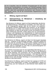 Es ist zu begrüßen, dass die rechtlichen Voraussetzungen für eine online- Nutzung des Handelsregisters und anderer auf Publizität angelegter öffentli- cher Register geschaffen worden sind. Datenschutzrechtlich ist aber sicher- zustellen, dass nicht automatisierte Suchroutinen nach Personen durchge- führt werden können, die bei der konventionellen Registereinsicht ausge- schlossen sind. 6 Bildung, Jugend und Sport 6.1 Datensammlung im Ministerium – Umstellung der Schuldatenerhebung Das Ministerium für Bildung, Jugend und Sport beabsichtigt, die jährliche Schuldatenerhebung in Brandenburg umzustellen. Zum einen habe sich in der Vergangenheit gezeigt, dass der bei Schulen und staatlichen Schulämtern erhobene Datenkatalog nicht ausreiche, um die Aufgaben des Ministeriums zu erfüllen. Zum anderen sei das bisherige papierför- mige Verfahren vor allem für die Schulen mit sehr viel Aufwand und einer hohen Fehlerquote verbunden, sodass dieses durch ein automatisiertes Verfahren unter Beteiligung des Landesbetriebs für Datenverarbeitung und Statistik abgelöst werden soll. Dabei ist grundsätzlich zu unterschei- den zwischen den personenbezogenen Daten der Lehrkräfte und denen der Schülerinnen und Schüler. Das Ministerium für Bildung, Jugend und Sport hat überzeugend dargelegt, dass der – verglichen mit der bisherigen Sachlage – wesentlich größere Da- tenumfang über die Lehrkräfte zur Erfüllung seiner Aufgaben erforderlich ist. Vor allem die erforderliche Ermittlung der Schüler-Lehrer-Relation ist derart komplex, dass es unabdingbar ist, eine Fülle von personenbezogenen Ein- zeldaten über jede Lehrkraft zu erheben. Die rechtlichen Voraussetzungen für eine regelmäßige Übermittlung von Leh- rereinsatz- und Unterrichtsdaten von den Schulen direkt an das Ministerium sind derzeit allerdings nicht ausreichend. Die hier einschlägige Vorschrift (§ 15 Abs. 1 Datenschutzverordnung Schulwesen – DSV) lässt eine Übermitt- lung personenbezogener Daten an das Ministerium nur in Einzelfällen zu. Im Übrigen können nach derzeitiger Rechtslage nur anonymisierte Daten an das Ministerium übermittelt werden. Das Ministerium für Bildung, Jugend und Sport hat zugesagt, § 15 DSV ent- sprechend seinen Bedürfnissen zu ändern und beabsichtigt in diesem Zu- sammenhang, auch den Katalog der zu übermittelnden Daten detailliert fest- zulegen. 106 Tätigkeitsbericht 2001 LDA Brandenburg