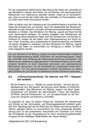 Für die vorgesehene elektronische Übermittlung der Daten der Lehrkräfte an das Ministerium müssen eine Reihe von technischen und organisatorischen Maßnahmen zum Datenschutz getroffen werden. Dabei ist zu berücksichti- gen, dass es sich bei den Daten über die Lehrkräfte um Personaldaten, also um Daten einer hohen Schutzstufe handelt. Offen ist bisher noch die Umstellung der Schuldatenerhebung hinsichtlich der Daten der Schülerinnen und Schüler. Auch hier beabsichtigt das Ministerium, ebenfalls für jede Schülerin und jeden Schüler personenbeziehbare Einzelda- tensätze zu erheben. Das Ministerium für Bildung, Jugend und Sport konnte nicht überzeugend darlegen, für welche Aufgaben des Ministeriums die Übermittlung derart detaillierter Daten über die Schülerinnen und Schüler er- forderlich ist, sodass wir die Gefahr einer Datenspeicherung auf Vorrat se- hen. Unser Vorschlag, den Landesbetrieb für Datenverarbeitung und Statistik mit diesen Aufgaben zu befassen und dem Ministerium für Bildung, Jugend und Sport die Daten nur anonymisiert zur Verfügung zu stellen, ist bisher nicht aufgegriffen worden. Die vom Ministerium für Bildung, Jugend und Sport beabsichtigte Umstellung der Schuldatenerhebung bedarf hinsichtlich der personenbezogenen Daten der Lehrkräfte einer Änderung der Datenschutzverordnung Schulwesen. Die Ablösung der weitgehend papiergestützten Schuldatenerhebung durch elekt- ronische Verfahren ist durch besondere technische und organisatorische Maßnahmen abzusichern, die der Sensibilität der verarbeiteten Daten Rech- nung tragen. Für eine personenbezogene zentrale Verarbeitung von Daten aller Schülerinnen und Schüler im Ministerium ist kein Erfordernis erkennbar. 6.2 „Führerscheinprüfung“ für Internet und PC – Klassen- ziel verfehlt! Mit der Initiative m.a.u.s – Medien an unsere Schulen – hat sich die Lan- desregierung zum Ziel gesetzt, die Nutzung neuer Medien im Unterricht voranzutreiben. Das Ministerium für Bildung, Jugend und Sport bietet Schülerinnen und Schülern der Sekundarstufe I hierzu die interaktive CD-ROM „Internet-Führerschein“ an, um Grundkenntnisse für die Nut- zung von Computer und Internet zu vermitteln. Zu begrüßen ist, dass mit diesem Projekt die Teilnahme der Schülerinnen und Schüler an der Informations- und Wissensgesellschaft erheblich geför- dert wird. Allerdings klärt die CD-ROM über die Risiken der Kommunikation in offenen, globalen Netzen nur unzureichend auf. Eine umfassende Sensibili- sierung auch für die vorhandenen Instrumente und Techniken zum Schutz der Privatsphäre ist die Voraussetzung für einen verantwortungsbewussten Umgang mit den vielfältigen Möglichkeiten der „Neuen Medien“. Tätigkeitsbericht 2001 LDA Brandenburg 107