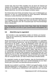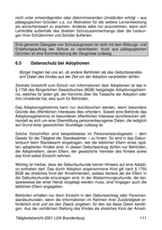 menden folgt, dass kaum Fälle vorstellbar sind, bei denen die Tatsache der Adoption für die Aufgaben anderer Behörden erforderlich sein soll. In der Re- gel wird es ausreichen, dass Behörden nur solche Informationen vom Stan- desamt bekommen, die nicht auf die Adoption schließen lassen. Der frühere Name des Kindes wird darüber hinaus auch im Melderegister ge- speichert. Er kann nur ausnahmsweise bei einem besonderen öffentlichen Interesse an andere Behörden übermittelt werden. Eine Auskunft über die Tatsache der Adoption aus dem Melderegister an Drit- te ist hingegen nur dann zulässig, wenn auch eine Einsicht in das Geburtsre- gister beim Standesamt unter den Voraussetzungen des Personenstandsge- setzes zulässig wäre. Das Adoptionsgeheimnis hat einen hohen Rang. Daten über die Adoption dürfen an Behörden und Dritte nur ganz ausnahmsweise weitergegeben wer- den. 6.6 Aktenführung im Jugendamt Bei Kontrollen in zwei Jugendämtern stellten wir Defizite und Unsicher- heiten bei der Aktenführung, Datenübermittlungen sowie Akteneinsichts- begehren fest. Bürger beschwerten sich bei uns über die Unvollständigkeit von Jugendhilfe- akten. Durch fehlende Paginierung – also die durchgehende, unveränderliche Nummerierung der Seiten – war für die Beteiligten schwer oder gar nicht nachzuweisen, ob Dokumente Bestandteil eines Vorgangs geworden sind. Dies verstößt gegen § 78 a des Zehnten Buches des Sozialgesetzbuches (SGB X). Aus der Verpflichtung des Jugendamtes, die erforderlichen techni- schen und organisatorischen Maßnahmen zu treffen, folgt auch eine Pflicht zur vollständigen Dokumentation aller Verarbeitungsvorgänge. Diese müssen für Akteneinsicht nehmende Dritte transparent und nachvollziehbar sein. Eine Paginierung, die vor allem dem Nachweis der Vollständigkeit der Akte dient, liegt auch im Interesse des Jugendamtes. Dadurch können Vermutungen, die Akte sei manipuliert worden, auf relativ einfache Weise entkräftet werden. Ein Jugendamt mussten wir darauf hinweisen, dass die Kenntnisnahme von personenbezogenen Daten Dritter durch Verfahrensbeteiligte bei der Akten- einsicht gem. § 25 SGB X als Datenübermittlung anzusehen ist. Deshalb muss zusätzlich zu § 25 Abs. 3 SGB X noch geprüft werden, ob eine Übermittlungsbefugnis im SGB gegeben ist. Nach § 25 Abs. 3 SGB X ist die Behörde zur Gewährung von Akteneinsicht nicht verpflichtet, wenn berechtig- 112 Tätigkeitsbericht 2001 LDA Brandenburg