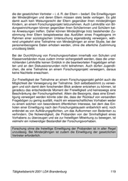 die der gesetzlichen Vertreter – i. d. R. der Eltern – bedarf. Die Einwilligungen der Minderjährigen und deren Eltern müssen stets beide vorliegen. Es gibt damit auch kein Weisungsrecht der Eltern gegenüber ihren minderjährigen Kindern, an einem Forschungsprojekt teilzunehmen. Auch Lehrkräfte von Bil- dungseinrichtungen können gegenüber ihren Schülerinnen und Schülern kei- ne Anweisungen treffen. Daher können Minderjährige trotz bestehender Zu- stimmung ihrer Eltern beispielsweise das Ausfüllen eines Fragebogens im Rahmen einer soziologischen Untersuchung eigenständig verweigern, wäh- rend umgekehrt eine Teilnahme von Minderjährigen an einer Studie, bei der personenbezogene Daten erhoben werden, ohne die elterliche Zustimmung unzulässig bleibt. Bei der Durchführung von Forschungsvorhaben innerhalb von Schulen und Klassenverbänden muss zudem immer sichergestellt werden, dass die unter- richtenden Lehrkräfte keinen Einblick in die beantworteten Fragebögen erhal- ten und an den Diskussionsrunden nicht teilnehmen. Auch dürfen Jugendli- chen, die eine Teilnahme an einem Forschungsprojekt verweigern, daraus keine Nachteile erwachsen. Zur Freiwilligkeit der Teilnahme an einem Forschungsprojekt gehört auch die Möglichkeit der Verweigerung der Teilnahme. Sich selbstbestimmt zu verwei- gern und sich damit dem forschenden Blick anderer entziehen zu können, ist geradezu das entscheidende Moment der Freiwilligkeit und keineswegs eine Beschränkung der Forschungsfreiheit. Allein die Besorgnis, dass eine Einwil- ligung verweigert werden könnte oder die, dass der Rücklauf von versandten Fragebögen zu gering ausfällt, macht ein wissenschaftliches Vorhaben weder zu einem solchen von besonderem öffentlichen Interesse, bei dem das Ein- holen einer Einwilligung nach den Forschungsklauseln entbehrlich wird, noch entbindet es von Aufklärungspflichten, um das Aufkommen von Bedenken zu verhindern. Die Notwendigkeit, die Probanden von der Sinnhaftigkeit eines Vorhabens zu überzeugen und sie zur freiwilligen Mitwirkung zu bewegen, ist vielmehr ein notwendiger Bestandteil der Forschungsvorhaben. Forschung ohne die freiwillige Einwilligung der Probanden ist in aller Regel unzulässig. Bei Minderjährigen ist zudem die Einwilligung der gesetzlichen Vertreter erforderlich. Tätigkeitsbericht 2001 LDA Brandenburg 119