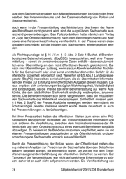Die Behörden müssen bei Ihrer Presse- bzw. Öffentlichkeitsarbeit prüfen, ob die veröffentlichten Daten der Wahrheit entsprechen, wenn der Sachverhalt Unklarheiten aufweist. Bei der Abwägung des öffentlichen Informationsinte- resses gegen das Geheimhaltungsinteresse des Betroffenen ist der jeweilige Verfahrensstand festzustellen und in die Ermessensentscheidung einzube- ziehen. Daten aus einem rechtskräftigen, freisprechenden Urteil sind nicht mit Daten aus einer Einstellung gem. § 170 Abs. 2 StPO gleichzusetzen und somit stets zu löschen. Um Fehlinformationen zu vermeiden und eine aktuelle Aktenführung zu ge- währleisten, muss die Staatsanwaltschaft die Polizei gem. § 482 StPO regel- mäßig und umfassend informieren. 4.2 Verfassungsschutz Im Berichtszeitraum hat der Landtag das überfällige Gesetz zur Rege- 47 lung von Sicherheitsüberprüfungen verabschiedet . Überprüft werden Personen, die eine sicherheitsrelevante Tätigkeit übernehmen sollen. Das Überprüfungsverfahren, an dem die Verfassungsschutzbehörde le- diglich mitwirkt, wird von der Dienststelle veranlasst. Mit dem Sicherheitsüberprüfungsgesetz ist eine wesentliche Rechtslücke für sensible Personaldaten geschlossen worden, auf die der Landesbeauftragte 48 wiederholt hingewiesen hat . Er hat im Gesetzgebungsverfahren eine Reihe von Änderungen vorgeschlagen, die nur zum Teil Eingang in das Gesetz ge- funden haben. Noch weitergehend als im Brandenburgischen Verfassungs- schutzgesetz sind hier die Kontrollbefugnisse des Landesbeauftragten einge- schränkt worden. Dem Landesbeauftragten persönlich wird die Auskunft ver- weigert, wenn die zuständige Aufsichts- oder Landesbehörde im Einzelfall feststellt, dass dadurch die Sicherheit des Bundes oder eines Bundeslandes gefährdet würde. Im Verfassungsschutzgesetz steht ihm in Person in solchen Fällen ein Auskunftsrecht zu. Das gilt auch bei Personen, denen im Rahmen einer Sicherheitsüberprüfung Vertraulichkeit zugesichert worden ist, für den Fall, dass diese sich an den Landesbeauftragten wenden. Damit ist der Landesbeauftragte in solchen Fällen daran gehindert, entspre- chend der Landesverfassung darauf zu dringen, dass das Grundrecht auf Da- tenschutz gewahrt wird. Dem Betroffenen bleibt nur der Weg vor die Gerichte. Auch das Einsichtsrecht der Betroffenen in die zu ihrer Person geführten Si- 47 GVBl. I 2001 S. 126 48 vgl. zuletzt Tätigkeitsbericht 2000, A 4.2 Tätigkeitsbericht 2001 LDA Brandenburg 77