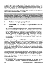 - den Informationsaustausch mit Partnern und Drittstaaten, - den Umfang der zu verarbeitenden Daten, - den Ermittlungsindex als Vorgangsverwaltung, - das Auskunftsrecht, - die Änderung, Berichtigung und Löschung, - Speicherungsfristen, - die Datensicherheit, - eine gemeinsame Kontrollinstanz und - den Rechtsschutz für die Betroffenen in die Konvention gefordert. Außerdem muss zum einen der Zugriff des deutschen EUROJUST-Mitgliedes auf das Bundeszentralregister und auf das Zentrale Staatsanwaltschaftliche Verfahrensregister in Deutschland auf eine eindeutige gesetzliche Grundlage gestellt werden. Zum anderen muss sie für EUROJUST ein Auskunftsrecht über strafrechtliche Ermittlungsverfahren in Deutschland etablieren. Ohne diese Rechtsgrundlage könnten die Ermittlungsbehörden der Bundesrepublik Deutschland nach § 474 Strafprozessordnung (StPO) derartigen Aus- kunftsersuchen nicht stattgeben. Gegenwärtig bereitet der Europäische Rat einen Beschluss über die Einrich- 57 tung von EUROJUST vor, der auch gewisse datenschutzrechtliche Rege- lungen enthalten soll. Der Abschluss einer Konvention ist bisher nicht vorge- sehen. EUROJUST sollte auf der Basis einer Konvention zwischen den Mitgliedstaa- ten eingerichtet werden, die einen ebenso hohen Datenschutzstandard vor- sieht wie die EUROPOL-Konvention. 57 Entwurf eines Ratsbeschlusses vom 19.10.2001, 12727/1/01 REV 1 Tätigkeitsbericht 2001 LDA Brandenburg 95