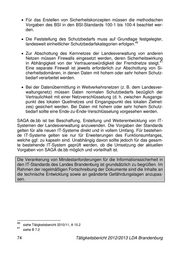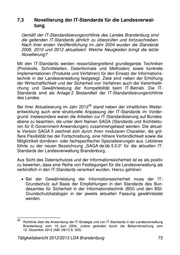 7.3 Novellierung der IT-Standards für die Landesverwal- tung Gemäß der IT-Standardisierungsrichtlinie des Landes Brandenburg sind die geltenden IT-Standards jährlich zu überprüfen und fortzuschreiben. Nach ihrer ersten Veröffentlichung im Jahr 2004 wurden die Standards 2008, 2010 und 2012 aktualisiert. Welche Neuigkeiten bringt die letzte Novellierung? Mit den IT-Standards werden ressortübergreifend grundlegende Techniken (Protokolle, Schnittstellen, Datenformate und Methoden) sowie konkrete Implementationen (Produkte und Verfahren) für den Einsatz der Informations- technik in der Landesverwaltung festgelegt. Ziele sind neben der Erhöhung der Wirtschaftlichkeit und der Sicherheit von Verfahren auch die Vereinheitli- chung und Gewährleistung der Kompatibilität beim IT-Betrieb. Die IT- Standards sind als Anlage 2 Bestandteil der IT-Standardisierungsrichtlinie des Landes. 39 Bei ihrer Aktualisierung im Jahr 2012 stand neben der inhaltlichen Weiter- entwicklung auch eine strukturelle Anpassung der IT-Standards im Vorder- grund. Insbesondere waren die Arbeiten zur IT-Standardisierung auf Bundes- ebene zu beachten, die unter dem Namen SAGA (Standards und Architektu- ren für E-Government-Anwendungen) zusammengefasst werden. Die aktuel- le Version SAGA 5 zeichnet sich durch ihren modularen Charakter, die grö- ßere Flexibilität bei der Fortschreibung, eine höhere Verbindlichkeit sowie die Möglichkeit domänen- oder fachspezifischer Spezialisierungen aus. Letzteres führte zu der neuen Bezeichnung „SAGA de.bb 5.0.0“ für die aktuellen IT- Standards der Landesverwaltung Brandenburg. Aus Sicht des Datenschutzes und der Informationssicherheit ist es als positiv zu bewerten, dass eine Reihe von Festlegungen für die Landesverwaltung als verbindlich in den IT-Standards verankert wurden. Hierzu gehören: Bei der Gewährleistung der Informationssicherheit muss der IT- Grundschutz auf Basis der Empfehlungen in den Standards des Bun- desamtes für Sicherheit in der Informationstechnik (BSI) und den BSI- Grundschutzkatalogen in der jeweils aktuellen Fassung gewährleistet werden. 39 Richtlinie über die Anwendung der IT-Strategie und von IT-Standards in der Landesverwaltung Brandenburg vom 15. Juni 2004, zuletzt geändert durch die Bekanntmachung vom 12. Dezember 2012 (ABl. 09/13 S. 505) Tätigkeitsbericht 2012/2013 LDA Brandenburg 73