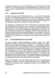 Erschwerend kommt hinzu, dass der Mietvertrag für den Standort des ZIT-BB ausläuft. Zur Gewährleistung der Planungssicherheit des ZIT-BB muss der schon seit Jahren geplante Neubau eines modernen Rechenzentrums forciert werden. 7.4.6 Fileserver des ZIT-BB Auf dem Fileserver des ZIT-BB befinden sich u. a. die Home-Verzeichnisse der Nutzer, die Dezernatsverzeichnisse und die Verzeichnisse von Projekt- gruppen. Die Passwortrestriktionen für die Benutzer entsprachen unseren Forderungen. Die minimale Passwortlänge der administrativen Zugänge und Dienstkonten sollte jedoch mindestens 14 Zeichen betragen. Die Vergabe von Zugriffsrechten sollte revisionssicher protokolliert werden. Zum Zeitpunkt der Kontrolle war es nur mit einem unverhältnismäßig hohen Aufwand möglich, die konkreten Rechte eines Benutzers zu ermitteln und zu dokumentieren. Das Serverbetriebssystem Windows 2008 stellt hierzu nur sehr rudimentäre Funktionen zur Verfügung. Darüber hinaus empfahlen wir dringend, zusätzliche Rechtemanagementsoftware zu beschaffen, mit der die Berechtigungen administriert und dokumentiert werden können. Weiterhin forderten wir die Erstellung und Umsetzung eines Virenschutzkonzepts für die Fileserver. 7.4.7 Kommunikationsserver des ZIT-BB Auf dem zentralen Kommunikationsserver werden neben den E-Mail- Postfächern der Beschäftigten des ZIT-BB selbst auch Postfächer von Mitar- beitern anderer Daten verarbeitenden Stellen (u. a. verschiedener Ministe- rien) ohne wirksame Trennung gespeichert. Diese gemeinsame Speicherung von Postfächern auf einem Server halten wir für unzulässig. Die Datenverar- beitung muss gem. § 7 Abs. 1 Satz 3 BbgDSG so organisiert sein, dass bei der Verarbeitung die Trennung der Daten nach den jeweils verfolgten Zwe- cken und nach unterschiedlichen Betroffenen möglich ist. Im Rahmen der Konsolidierung der E-Mail-Systeme in der Landesverwaltung sind deshalb die Postfächer der verschiedenen Daten verarbeitenden Stellen schnellstmöglich auf separaten physischen oder virtuellen Servern abzulegen. Weiterhin bemängelten wir, dass Softwaretests derzeit im Produktivsystem durchgeführt werden. Dadurch können Störungen nicht ausgeschlossen werden. Zur Sicherstellung der Verfügbarkeit forderten wir die Installation von Testsystemen. 78 Tätigkeitsbericht 2012/2013 LDA Brandenburg