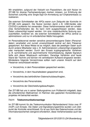 Wir empfahlen, aufgrund der Vielzahl von Passwörtern, die sich Nutzer im ZIT-BB für diverse Fachanwendungen merken müssen, zur Erhöhung der Sicherheit zukünftig eine Single-Sign-On-Anmeldung auf Chipkartenbasis zu realisieren. Die externen Schnittstellen der APCs waren zum Zeitpunkt der Kontrolle im ZIT-BB nicht gesperrt. Die Nutzer konnten damit z. B. USB-Geräte oder CD/DVD-Laufwerke frei verwenden. Diese Verfahrensweise stellt ein erhebli- ches Sicherheitsrisiko dar. Es kann nicht ausgeschlossen werden, dass Daten unberechtigt kopiert werden. Um eine missbräuchliche Nutzung aus- zuschließen, forderten wir, die externen Schnittstellen der APCs zentral zu administrieren und nur im erforderlichen Maße freizugeben. Im Personaldezernat werden sensitive personenbezogene Daten (Personal- daten) verarbeitet und zurzeit unverschlüsselt zentral auf dem Fileserver gespeichert. Auf diese Weise ist es möglich, dass die jeweiligen Daten auch durch andere Mitarbeiter (wie z. B. Administratoren) unberechtigt eingesehen oder manipuliert werden. Durch den Einsatz kryptographischer Verfahren (z. B. symmetrische und asymmetrische Verschlüsselung, digitale Signatur) ließe sich dieser Missbrauch verhindern. Derartige Verfahren sind heute Stand der Technik und können mit vertretbarem Aufwand eingesetzt werden. Mindestens folgende Verzeichnisse sollten nach unserer Ansicht auf dem Fileserver verschlüsselt werden: Verzeichnis, in dem Personaldaten gespeichert werden, Verzeichnis, in dem Haushaltsdaten gespeichert sind, Verzeichnis des behördlichen Datenschutzbeauftragten, Verzeichnis des Personalrates, Verzeichnis der Gleichstellungsbeauftragten. Der ZIT-BB hat uns in seiner Stellungnahme zum Prüfbericht mitgeteilt, dass die erforderlichen Maßnahmen im Rahmen des geplanten Konsolidierungs- projektes mit betrachtet werden. 7.4.11 Telekommunikationsanlage Im ZIT-BB kommt für die Telekommunikation flächendeckend Voice over IP (VoIP) zum Einsatz. Die Daten und Signalisierungsströme wurden zum Zeit- punkt der Kontrolle verschlüsselt. Es ist aus Sicht des Datenschutzes und der Informationssicherheit zwingend erforderlich, diese Verfahrensweise auch bei 80 Tätigkeitsbericht 2012/2013 LDA Brandenburg