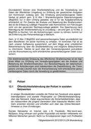 Grundsätzlich können eine Straßenbefahrung und die Verarbeitung von Daten der öffentlichen Umgebung zur Erfüllung der gesetzlichen Aufgaben von Kommunen zulässig sein. Die Erhebung personenbezogener Daten hierbei ist jedoch gem. § 12 Abs. 1 Brandenburgische Datenschutzgesetz (BbgDSG) nur in dem Umfang gestattet, wie er für die Aufgabenerfüllung erforderlich ist. Für Zwecke der Analyse und Bewertung des Straßenzustan- des ist die Erfassung zufälliger Passanten oder Kennzeichen von Fahrzeugen nicht von der genannten Rechtsgrundlage gedeckt. Ihre Speicherung nach Beendigung der Straßenbefahrung ist unzulässig – sie sind gem. § 19 Abs. 2 BbgDSG zu löschen. Um die Aufzeichnungen nutzen zu können, kommt nur die Entfernung des Personenbezugs in Betracht. Gem. § 12 Abs. 2 BbgDSG sind personenbezogene Daten grundsätzlich bei dem Betroffenen mit seiner Kenntnis zu erheben. Im konkreten Fall ist es nach unserer Auffassung ausreichend, auf dem Wege einer ortsüblichen Bekanntmachung über die Straßenbefahrung und mögliche Bildaufnahmen zu informieren. Hierbei ist auch über den Verwendungszweck aufzuklären und die Anonymisierung nicht erforderlicher personenbezogener Daten zuzu- sichern. Die dreidimensionale Erfassung des öffentlichen Straßenraumes ist ein legi- times Mittel zur Erfüllung von Verwaltungsaufgaben wie die Analyse und Bewertung der Straßeninfrastruktur. Zur Berücksichtigung der datenschutz- rechtlichen Anforderungen sind insbesondere die Zweckbindung, die Trans- parenz und das Löschen bzw. die Anonymisierung nicht erforderlicher perso- nenbezogener Daten durch die Verwaltung zu gewährleisten. 12 Polizei 12.1 Öffentlichkeitsfahndung der Polizei in sozialen Netzwerken In einigen Bundesländern erstellte die Polizei bei Facebook eine eigene Internetpräsenz und startete Pilotprojekte zur Öffentlichkeitsfahndung über das Netzwerk. Dabei argumentieren die Sicherheitsbehörden, dass sie insbesondere die jüngere Generation über klassische Medien nicht mehr erreichen könnten und erhofften sich über das Online-Netzwerk Hinweise zu ihren Ermittlungen. Soziale Netzwerke im Internet (wie z. B. Facebook, Wer-kennt-wen, MySpace, Xing) erfreuen sich großer Popularität und werden mittlerweile von Millionen Menschen genutzt. Nicht nur Einzelpersonen legen sich Profilseiten 100 Tätigkeitsbericht 2012/2013 LDA Brandenburg
