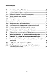 Inhaltsverzeichnis 1. Informationsfreiheit und Trillerpfeifen ................................................................... 3 2. Informationsfreiheit in Bremen .............................................................................. 6 2.1 Novellierung des Bremer Informationsfreiheitsgesetzes ............................................ 6 2.2 Anträge gegenüber unserer Behörde ........................................................................ 7 2.3 Beratung von Behörden ............................................................................................ 7 2.4 Festnahme von Terrorverdächtigen........................................................................... 9 2.5 Hubrettungsfahrzeuge der Feuerwehr Bremen ........................................................10 2.6 Auskunft über Namen und Adresse eines Grundstückseigentümers ........................10 2.7 Zugang zu Informationen der berufsständischen Kammern .....................................11 2.8 Informationszugang bei den Fachdiensten für Arbeitsschutz ....................................11 3. Entwicklung der Informationsfreiheit in Deutschland .........................................11 4. Aktuelle Rechtsprechung zur Informationsfreiheit in Deutschland ...................12 5. Arbeitskreis und Konferenz der Informationsfreiheitsbeauftragten ...................13 6. Die aktuellen Entschließungen der Informationsfreiheitsbeauftragten in Deutschland ...........................................................................................................13 6.1 Auch Kammern sind zur Transparenz verpflichtet! ...................................................13 6.2 Mehr Transparenz bei den Verhandlungen über das Transatlantische Freihandelsabkommen (TTIP)! .................................................................................14 2