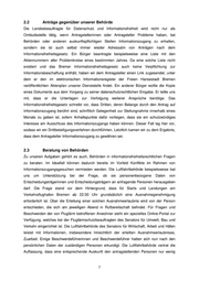 2.2 Anträge gegenüber unserer Behörde Die Landesbeauftragte für Datenschutz und Informationsfreiheit wird nicht nur als Ombudsstelle tätig, wenn Antragstellerinnen oder Antragsteller Probleme haben, bei Behörden oder anderen auskunftspflichtigen Stellen Informationszugang zu erhalten, sondern sie ist auch selbst immer wieder Adressatin von Anträgen nach dem Informationsfreiheitsgesetz. Ein Bürger beantragte beispielsweise eine Liste mit den Aktennummern aller Problemkreise eines bestimmten Jahres. Da eine solche Liste nicht existiert und das Bremer Informationsfreiheitsgesetz auch keine Verpflichtung zur Informationsbeschaffung enthält, haben wir dem Antragsteller einen Link zugesendet, unter dem er den im elektronischen Informationsregister der Freien Hansestadt Bremen veröffentlichten Aktenplan unserer Dienststelle findet. Ein anderer Bürger wollte die Kopie eines Dokuments aus dem Vorgang zu seiner datenschutzrechtlichen Eingabe. Er teilte uns mit, dass er die Unterlagen zur Verfolgung weiterer Ansprüche benötige. Das Informationsfreiheitsgesetz schreibt vor, dass Dritten, deren Belange durch den Antrag auf Informationszugang berührt sind, schriftlich Gelegenheit zur Stellungnahme innerhalb eines Monats zu geben ist, sofern Anhaltspunkte dafür vorliegen, dass sie ein schutzwürdiges Interesse am Ausschluss des Informationszugangs haben können. Dieser Fall lag hier vor, sodass wir ein Drittbeteiligungsverfahren durchführten. Letztlich kamen wir zu dem Ergebnis, dass dem Antragsteller Informationszugang zu gewähren sei. 2.3 Beratung von Behörden Zu unseren Aufgaben gehört es auch, Behörden in informationsfreiheitsrechtlichen Fragen zu beraten. Im Idealfall können dadurch bereits im Vorfeld Konflikte im Rahmen von Informationszugangsgesuchen vermieden werden. Die Luftfahrtbehörde beispielsweise bat uns um Unterstützung bei der Frage, ob sie personenbezogene Daten von Entscheidungsträgerinnen und Entscheidungsträgern an anfragende Personen herausgeben darf. Die Frage stand vor dem Hintergrund, dass für Starts und Landungen am Verkehrsflughafen Bremen ab 22:30 Uhr grundsätzlich eine Ausnahmegenehmigung erforderlich ist. Über die Erteilung einer solchen Ausnahmeerlaubnis wird von der Person entschieden, die sich am jeweiligen Abend in Rufbereitschaft befindet. Für Fragen und Beschwerden der von Fluglärm betroffenen Anwohner steht ein spezielles Online-Portal zur Verfügung, welches bei der Fluglärmschutzbeauftragten des Senators für Umwelt, Bau und Verkehr eingerichtet ist. Die Luftfahrtbehörde des Senators für Wirtschaft, Arbeit und Häfen leistet mit Informationen, insbesondere hinsichtlich der erteilten Ausnahmeerlaubnisse, Zuarbeit. Einige Beschwerdeführerinnen und Beschwerdeführer hatten sich nun nach den persönlichen Daten der zuständigen Personen erkundigt. Die Luftfahrtbehörde vertrat die Auffassung, dass eine entsprechende Auskunft den antragstellenden Personen nur wenig 7