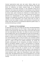 Commons" gekennzeichnet worden waren oder werden. Dahinter verbirgt sich eine gemeinnützige Organisation, die verschiedene Lizenzverträge veröffentlicht. Diese Verträge können von Urheberinnen und Urhebern verwendet werden, um der Öffentlichkeit Nutzungsrechte an ihren Werken einzuräumen. Je nach verwendetem Vertrag wird die Nutzung mehr oder weniger stark eingeschränkt und somit teilweise auf das Urheberrecht verzichtet. Die entsprechenden Werke werden mit verschiedenen Kürzeln gekennzeichnet, die erkennen lassen, welche Verwendung die Urheberinnen und Urheber erlauben. Wir teilten der Senatorin für Finanzen mit, dass nach unserer Auffassung die Kennzeichnung der Dokumente des Transparenzportals nur dann zulässig ist, wenn sie gesetzlichen Regelungen nicht entgegensteht. Das bedeutet, dass Dokumente, die keinem Urheberrecht unterliegen, mit keiner einschränkenden Lizenz versehen werden dürfen. Wir halten es zudem für sinnvoll, einen Leitfaden zu erstellen, wie die Dokumente zu kennzeichnen sind. Darüber hinaus sollen technische und organisatorische Maßnahmen getroffen werden, um eine falsche Kennzeichnung zu verhindern. 2.4 Festnahme von Terrorverdächtigen Ein Petent teilte uns mit, dass er eine Anfrage nach dem Bremer Informationsfreiheitsgesetz bezüglich eines Antiterroreinsatzes, der sich im Frühjahr in Bremen ereignet hatte, an den Senator für Inneres gerichtet habe. Neben seinen Fragen zu dem Einsatz wollte der Petent auch noch einige allgemeine Dinge wissen. Vom Senator für Inneres war dem Petenten pauschal mitgeteilt worden, dass aus ermittlungstaktischen Gründen keine Einzelanfragen zu einem noch laufenden Verfahren beantwortet würden. Wir teilten dem Senator für Inneres daraufhin mit, dass nach den Vorschriften des Bremer Informationsfreiheitsgesetzes von einer informationspflichtigen Stelle ein Antrag auf Zugang zu dort vorhandenen amtlichen Informationen nur dann abgelehnt werden darf, wenn ein gesetzlicher Ausnahmetatbestand erfüllt ist. In diesem Fall ergeht eine schriftliche Entscheidung, die innerhalb einer Monatsfrist, beziehungsweise bei sehr umfangreichen und komplexen Informationen mit Ablauf von zwei Monaten zugänglich zu machen ist. Die Entscheidung ist zu begründen. Einen allgemeinen Verweis auf ein laufendes Verfahren halten wir für nicht ausreichend, zumal sich ein Teil des Antrags auf Informationen bezieht, die gar kein laufendes Verfahren betreffen. Der Senator für Inneres teilte uns daraufhin mit, dass er den Antragsteller hinsichtlich der Fragen, die das schwebende Verfahren betreffen, an das Justizressort als Herr des Verfahrens verwiesen habe. Die übrigen Fragen könnten durch den Senator für Inneres beantwortet werden. Aufgrund des Arbeitsaufwands müssten jedoch Gebühren erhoben werden. Bei Redaktionsschluss stand noch nicht abschließend fest, ob der Petent an seinem Antrag festhält oder aufgrund der anfallenden Gebühren auf die Informationen verzichtet. 9