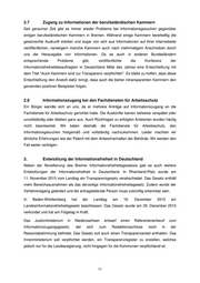 2.7 Zugang zu Informationen der berufsständischen Kammern Seit geraumer Zeit gibt es immer wieder Probleme bei Informationsgesuchen gegenüber einigen berufsständischen Kammern in Bremen. Während einige Kammern bereitwillig die gewünschte Auskunft erteilen und sogar von sich aus Informationen auf ihrer Internetseite veröffentlichen, verweigern manche Kammern auch nach mehrmaligem Anschreiben durch uns die Herausgabe von Informationen. Da es auch in anderen Bundesländern entsprechende Probleme gibt, veröffentlichte die Konferenz der Informationsfreiheitsbeauftragten in Deutschland Mitte des Jahres eine Entschließung mit dem Titel "Auch Kammern sind zur Transparenz verpflichtet!". Es bleibt zu hoffen, dass diese Entschließung den Anstoß dafür bringt, dass auch die bisher intransparenten Kammern den genannten positiven Beispielen folgen. 2.8 Informationszugang bei den Fachdiensten für Arbeitsschutz Ein Bürger wandte sich an uns, da er mehrere Anträge auf Informationszugang an die Fachdienste für Arbeitsschutz gerichtet hatte. Die Auskünfte kamen teilweise verspätet oder unvollständig oder blieben ganz aus. Auch Rückfragen zu erfolgten Antworten wurden häufig nicht beantwortet. Wir baten deshalb die Fachdienste für Arbeitsschutz, den Informationsgesuchen fristgemäß und vollständig nachzukommen. Leider machten wir ähnliche Erfahrungen wie der Petent mit dem Antwortverhalten der Behörde. Wir werden den Fall weiter verfolgen. 3. Entwicklung der Informationsfreiheit in Deutschland Neben der Novellierung des Bremer Informationsfreiheitsgesetzes gab es auch weitere Entwicklungen der Informationsfreiheit in Deutschland. In Rheinland-Pfalz wurde am 11. November 2015 vom Landtag ein Transparenzgesetz verabschiedet. Das Gesetz enthält mehr Bereichsausnahmen als das derzeitige Informationsfreiheitsgesetz. Zudem wurde der Verfahrensgang geändert und die antragstellende Person muss zukünftig erkennbar sein. In Baden-Württemberg hat der Landtag am 16. Dezember 2015 ein Landesinformationsfreiheitsgesetz beschlossen. Das Gesetz wurde am 29. Dezember 2015 verkündet und trat am Folgetag in Kraft. Das Justizministerium in Niedersachsen entwarf einen Referentenentwurf zum Informationszugangsgesetz, der sich zum Redaktionsschluss noch in der Ressortabstimmung befindet. Das Gesetz soll auch einen Transparenzanteil enthalten. Das Innenministerium soll verpflichtet werden, ein Transparenzregister zu erstellen, welches jedoch nur für die Landesregierung, nicht hingegen für die Kommunen verpflichtend ist. 11