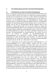 2.3 Neue Aufgaben für den Landesbeauftragten für Datenschutz und Informationsfreiheit Durch das Bremer Informationsfreiheitsgesetz wird dem Landesbeauftragten für Datenschutz die Kontrolle über die Einhaltung der Vorschriften des Informationsfreiheitsgesetzes in der Rolle des Landesbeauftragten für Informationsfreiheit übertragen. Ähnlich wie im Bereich des Datenschutzes kann der Einsicht begehrende Bürger nicht selbst überprüfen, ob ihm im erforderlichen Maße Einsicht in vorhandene Informationssammlungen gewährt wird. Mit den Regelungen nach dem BremIFG sind mir eine Reihe neuer Aufgaben zugewachsen. So überwache ich nicht nur die Einhaltung des Bremer Informationsfreiheitsgesetzes, sondern auch andere Vorschriften zur Informationsfreiheit bei den öffentlichen Stellen des Landes Bremen, z. B. das Umweltinformationsgesetz (UIG). Jeder kann den Landesbeauftragten anrufen, wenn er sein Recht auf Informationszugang als verletzt ansieht (§ 12 Abs. 1 BremIFG). Die öffentlichen Stellen sind verpflichtet, den Landesbeauftragten bei der Erfüllung seiner Aufgaben zu unterstützen, u. a. die Einsicht in Unterlagen zu gewähren. Der Landesbeauftragte kann Empfehlungen zur Verbesserung der Informationsfreiheit geben, die öffentlichen Stellen in Fragen der Informationsfreiheit beraten und bei Verstößen oder sonstigen Mängeln Vorschläge zur Beseitigung der Mängel machen sowie bei deren Missachtung eine Beanstandung aussprechen. Über Entwürfe für Rechts- oder Verwaltungsvorschriften sowie Planungen zum Aufbau neuer automatisierter Informationssysteme ist der Landesbeauftragte rechtzeitig zu unterrichten. Der Landesbeauftragte kann von der Bürgerschaft mit der Erstattung von Gutachten oder der Durchführung von Untersuchungen in Fragen der Informationsfreiheit betraut werden. Über seine Tätigkeit legt der Landesbeauftragte für Informationsfreiheit der Bürgerschaft jährlich einen Bericht vor. 6