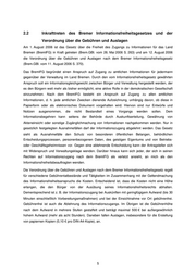 2.2 Inkrafttreten des Bremer Informationsfreiheitsgesetzes und der Verordnung über die Gebühren und Auslagen Am 1. August 2006 ist das Gesetz über die Freiheit des Zugangs zu Informationen für das Land Bremen (BremIFG) in Kraft getreten (Brem.GBl. vom 26. Mai 2006 S. 263) und am 12. August 2006 die Verordnung über die Gebühren und Auslagen nach dem Bremer Informationsfreiheitsgesetz (Brem.GBl. vom 11. August 2006 S. 370). Das BremIFG begründet einen Anspruch auf Zugang zu amtlichen Informationen für jedermann gegenüber der Verwaltung im Land Bremen. Durch den vom Informationsfreiheitsgesetz gewährten Anspruch soll ein Informationsgleichgewicht zwischen Bürger und Verwaltung hergestellt werden, der es den Bürgern weit mehr als bisher ermöglicht, eine aktive Rolle in der demokratischen Gesellschaft einzunehmen. Nach dem BremIFG besteht ein Anspruch auf Zugang zu allen amtlichen Informationen, d. h. jede amtlichen Zwecken dienende Aufzeichnung, unhängig davon, ob diese in Papierform oder als elektronisches Dokument vorgehalten wird. Hiervon sind nur Entwürfe und Notizen ausgenommen, die nicht Bestandteil eines Vorgangs werden sollen. Dem Informationsbegehren kann seitens der Behörde durch Auskunftserteilung, Gewährung von Akteneinsicht oder sonstige Zugänglichmachung von Informationen nachgekommen werden. Nur in gesetzlich festgelegten Ausnahmefällen darf der Informationszugang abgelehnt werden. Das Gesetz sieht als Ausnahmefälle den Schutz von besonderen öffentlichen Belangen, behördlichen Entscheidungsprozessen, personenbezogenen Daten, des geistigen Eigentums und von Betriebs- oder Geschäftsgeheimnissen vor. Gegen eine ablehnende Entscheidung kann der Antragsteller sich mit Widerspruch und Verwaltungsklage wenden. Darüber hinaus kann sich jeder, der sich in seinen Rechten auf Informationszugang nach dem BremIFG als verletzt ansieht, an mich als den Informationsfreiheitsbeauftragten wenden. Die Verordnung über die Gebühren und Auslagen nach dem Bremer Informationsfreiheitsgesetz regelt für verschiedene Gebührentatbestände und Tätigkeiten im Zusammenhang mit der Geltendmachung des Informationsfreiheitsanspruchs die Kosten. Entscheidend ist, dass die Kosten nicht eine Höhe erlangen, die den Bürger von der Ausübung seines Informationsfreiheitsrechts abhalten. Dementsprechend ist z. B. der Informationszugang bei Auskünften mit geringfügigem Aufwand (bis 30 Minuten einschließlich Vorbereitungsmaßnahmen) und bei der Einsichtnahme vor Ort gebührenfrei. Gebührenfrei ist auch die Ablehnung des Informationszugangs. Im Übrigen ist die Gebührenhöhe nach dem Aufwand in mehrere Stufen gestaffelt und beträgt maximal 500 € bei außergewöhnlich hohem Aufwand (mehr als acht Stunden). Daneben fallen Auslagen, insbesondere für die Erstellung von papiernen Kopien (0,10 € pro DIN-A4-Kopie), an. 5