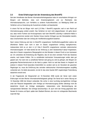 2.5 Erste Erfahrungen bei der Anwendung des BremIFG Seit dem Inkrafttreten des Bremer Informationsfreiheitsgesetzes habe ich verschiedene Anfragen von Bürgern und Behörden, etwa zum Anwendungsbereich und zur Reichweite des Informationsanspruchs, zum Verhältnis zu anderen Auskunftsrechten, zur Beteiligung Dritter am Verfahren und zur Anwendung der Ausnahmen erhalten und beantwortet. In einem Fall hat ein Bürger mich nach § 12 Abs. 1 BremIFG angerufen, weil er sein Recht auf Informationszugang verletzt ansieht. Das Verfahren ist noch nicht abgeschlossen. Ich gehe davon aus, dass meine Funktion als Anrufungsinstanz nach dem BremIFG zukünftig in stärkerem Maße in Anspruch genommen werden wird. Darüber hinaus machen Anfragen aus den Dienststellen deutlich, dass Unsicherheiten über den Umfang der Veröffentlichungspflicht bestehen. Nach meiner Erfahrung wird den im BremIFG vorgesehenen Veröffentlichungspflichten seitens der öffentlichen Stellen noch nicht in dem im Gesetz vorgesehenen Umfang nachgekommen, insbesondere fehlt es an dem in § 11 Abs. 5 BremIFG vorgesehenen zentralen elektronischen Informationsregister. Ich hatte bereits bei der Anhörung zu dem Gesetzentwurf darauf hingewiesen, dass die im Gesetz vorgesehene Übergangsfrist von drei Monaten in diesem Punkt zu kurz bemessen sei. Ich unterstütze die Entwicklung des Registers, das ich als einen zentralen Punkt des Gesetzes ansehe, nach besten Kräften. Die zu schaffenden technischen Voraussetzungen wollen aber gut geplant sein. Nur wenn der zu schaffende Rahmen weit genug ist, wird es gelingen, den Bürgern ein geeignetes Rechercheinstrument an die Hand zu geben. Nicht nur weil das Gesetz im Vergleich mit anderen in diesem Punkt besonders fortschrittlich ist, sondern weil es ein Herzstück der gesamten Regelungen ist, muss die Einführung des zentralen elektronischen Informationsregisters sorgfältig vorbereitet sein. Es bleibt abzuwarten, ob die für das erste Quartal 2007 angekündigte Freischaltung tatsächlich erreicht wird. In der Fragestunde der Bürgerschaft am 16. November 2006 wurde der Senat nach ersten Erfahrungen mit dem Bremer Informationsfreiheitsgesetz gefragt. Der Senat hat in seiner Sitzung am 12. Dezember 2006 die Antwort vorbereitet. Die vorher in einer kurzfristig durchgeführten Umfrage unter den Ressorts festgestellten zehn Anträge auf Informationszugang dürften allerdings nicht die tatsächliche Anzahl der Anträge wiedergeben, insbesondere unter Berücksichtigung der nachgeordneten Behörden. Die Umfrage berücksichtigt z. B. auch nicht den Antrag gegenüber dem Senator für Inneres und Sport, später dem Stadtamt Bremen, der einer mir vorliegenden Beschwerde zugrunde liegt. 8