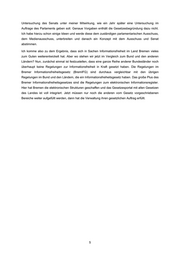 Untersuchung des Senats unter meiner Mitwirkung, wie ein Jahr später eine Untersuchung im Auftrage des Parlaments geben soll. Genaue Vorgaben enthält die Gesetzesbegründung dazu nicht. Ich habe hierzu schon einige Ideen und werde diese dem zuständigen parlamentarischen Ausschuss, dem Medienausschuss, unterbreiten und danach ein Konzept mit dem Ausschuss und Senat abstimmen. Ich komme also zu dem Ergebnis, dass sich in Sachen Informationsfreiheit im Land Bremen vieles zum Guten weiterentwickelt hat. Aber wo stehen wir jetzt im Vergleich zum Bund und den anderen Ländern? Nun, zunächst einmal ist festzustellen, dass eine ganze Reihe anderer Bundesländer noch überhaupt keine Regelungen zur Informationsfreiheit in Kraft gesetzt haben. Die Regelungen im Bremer Informationsfreiheitsgesetz (BremIFG) sind durchaus vergleichbar mit den übrigen Regelungen im Bund und den Ländern, die ein Informationsfreiheitsgesetz haben. Das große Plus des Bremer Informationsfreiheitsgesetzes sind die Regelungen zum elektronischen Informationsregister. Hier hat Bremen die elektronischen Strukturen geschaffen und das Gesetzesportal mit allen Gesetzen des Landes ist voll integriert. Jetzt müssen nur noch die anderen vom Gesetz vorgeschriebenen Bereiche weiter aufgefüllt werden, dann hat die Verwaltung ihren gesetzlichen Auftrag erfüllt. 5